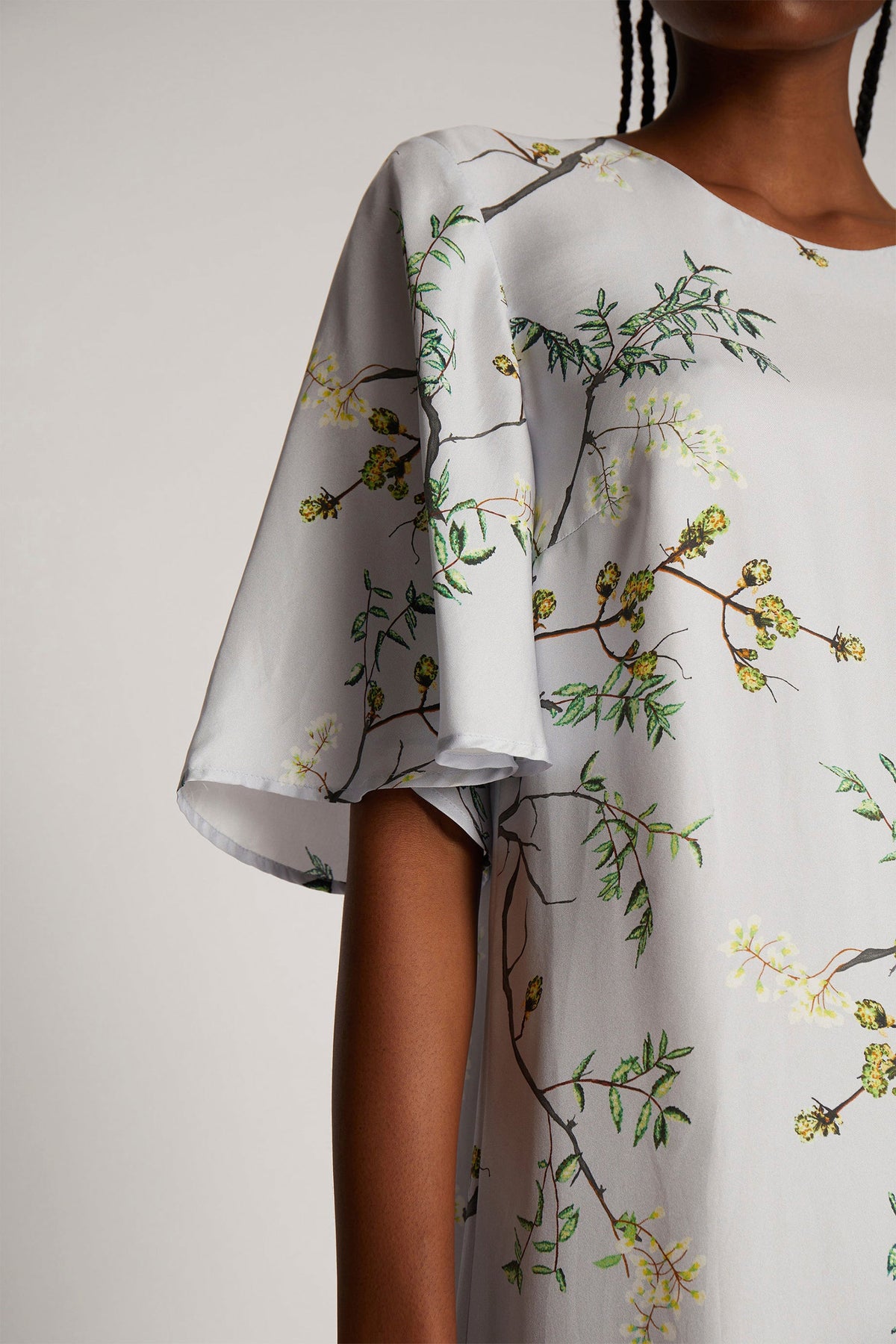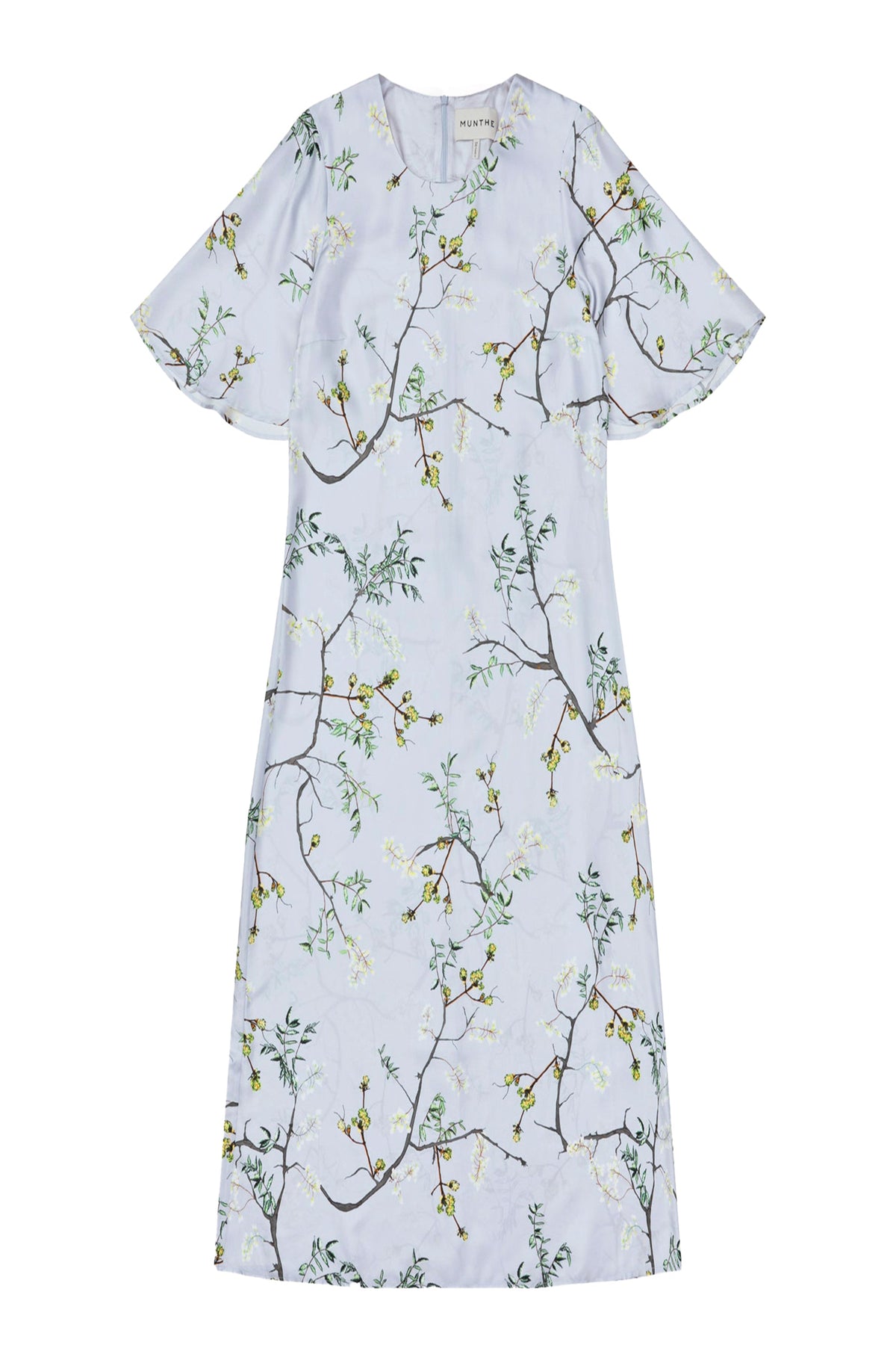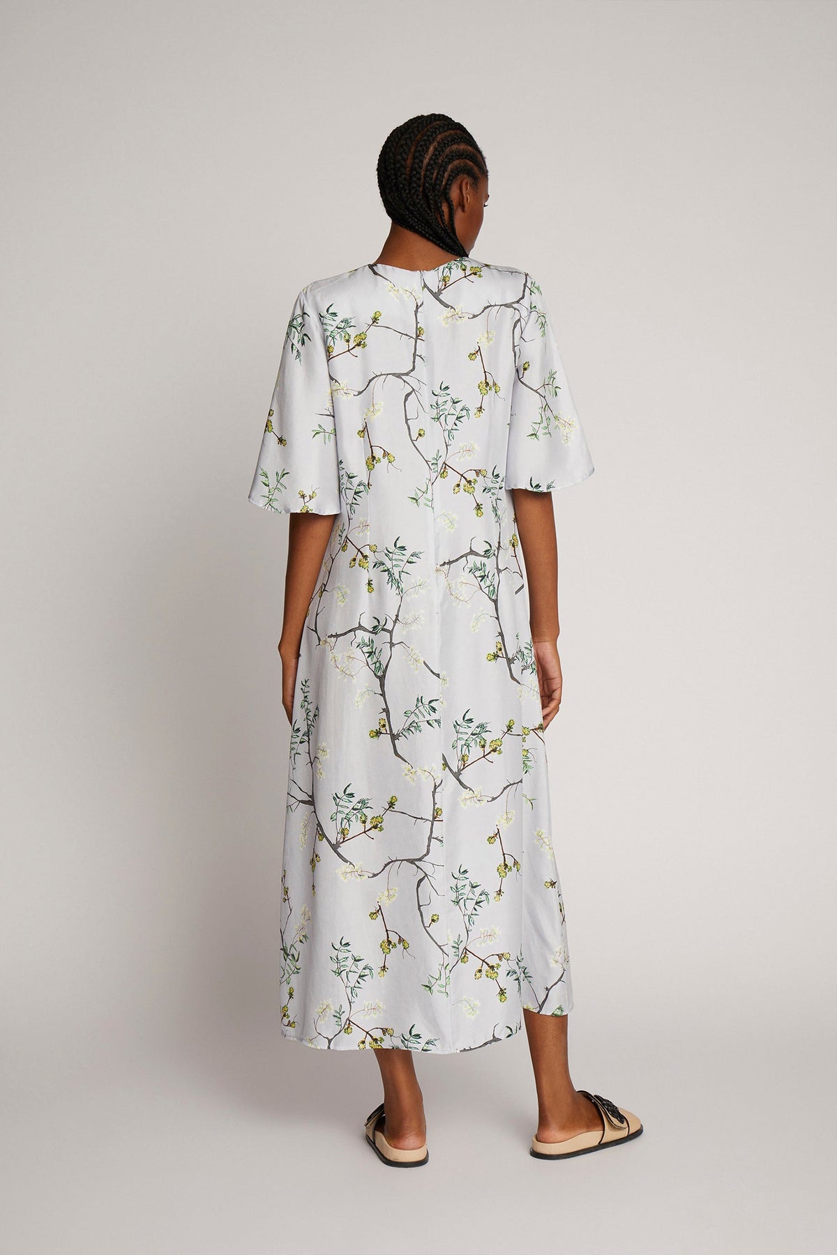 Dress with a beautiful all-over print made from 100% silk. The dress has short, loose sleeves, an elegant v-neck and a zip closure on the back.
