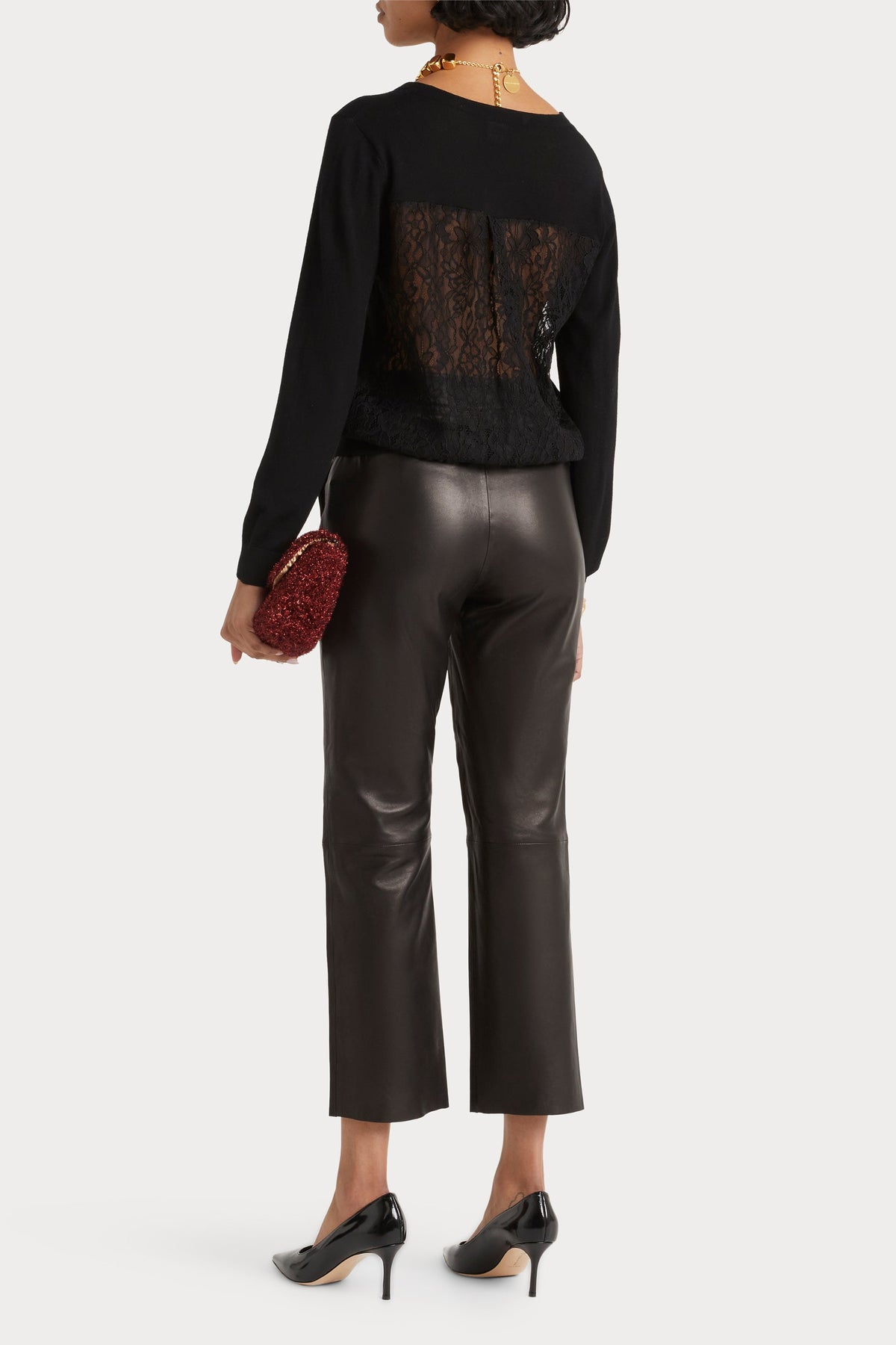 - Regular fit knit- Long sleeve- V-neckline- Back features a contrast black lace