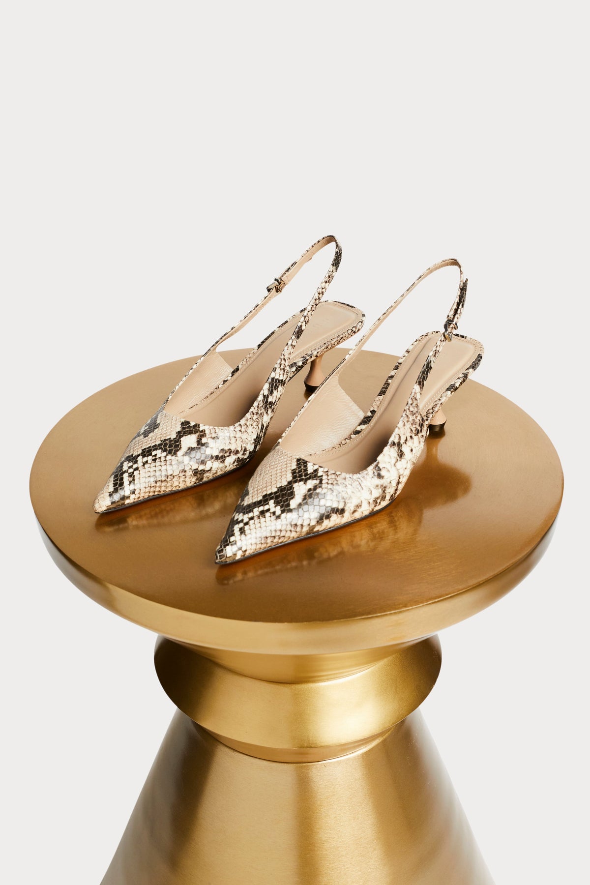 Made in Brazil, this pointed slingback features textured snake leather, a sculptural resin heel, and a leather sock and lining for all-day comfort. Stylish and versatile, it adds a modern edge to any outfit.