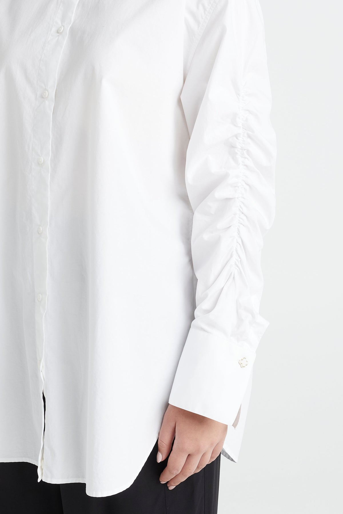 - Clover button detail on the collar stand and cuffs