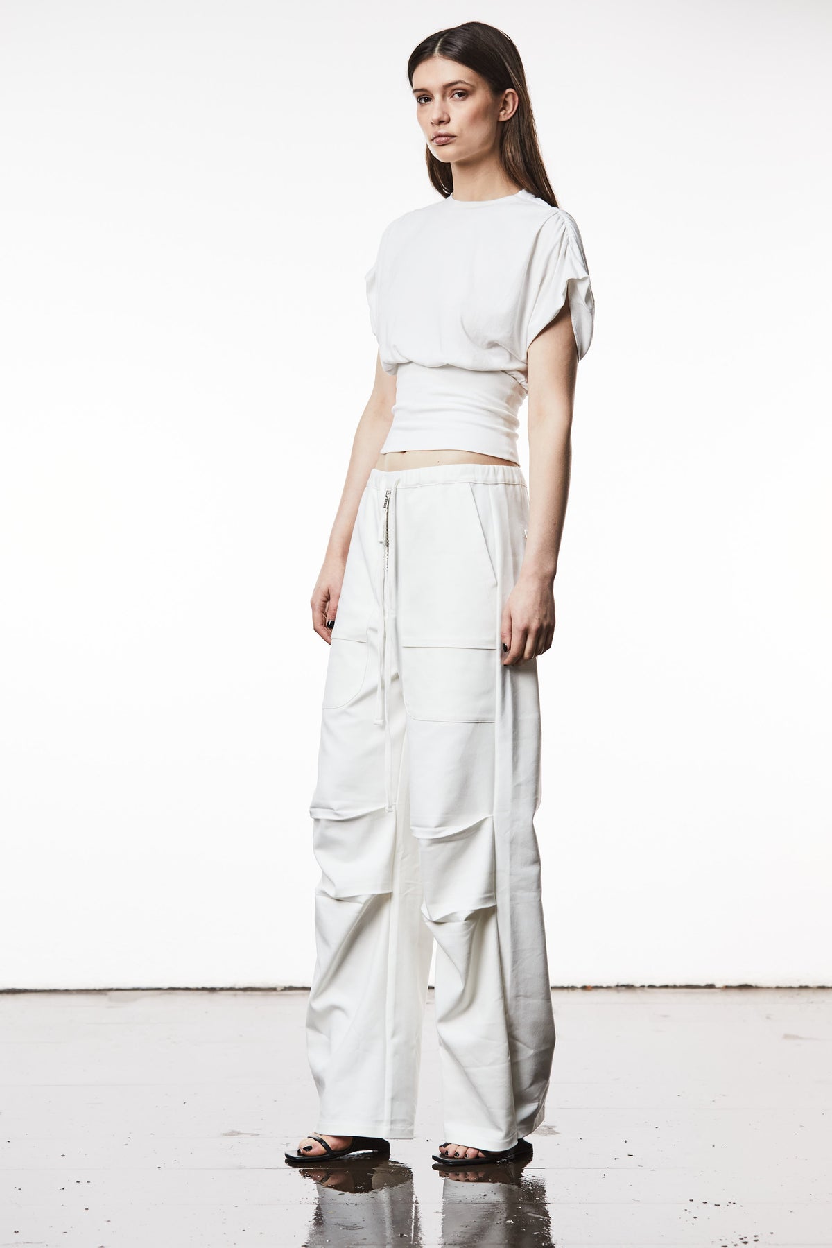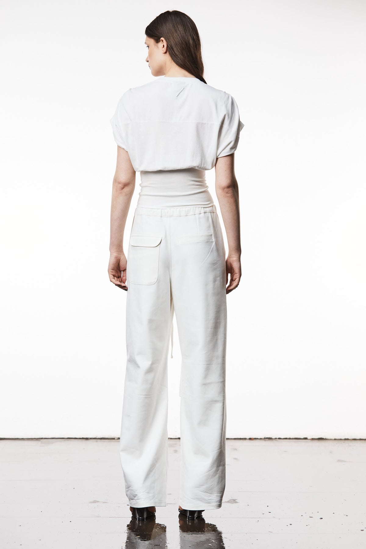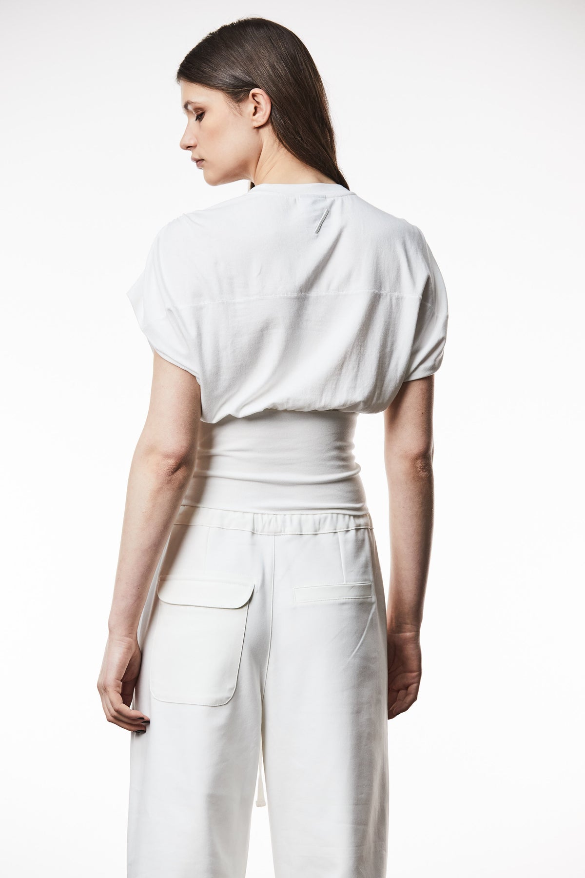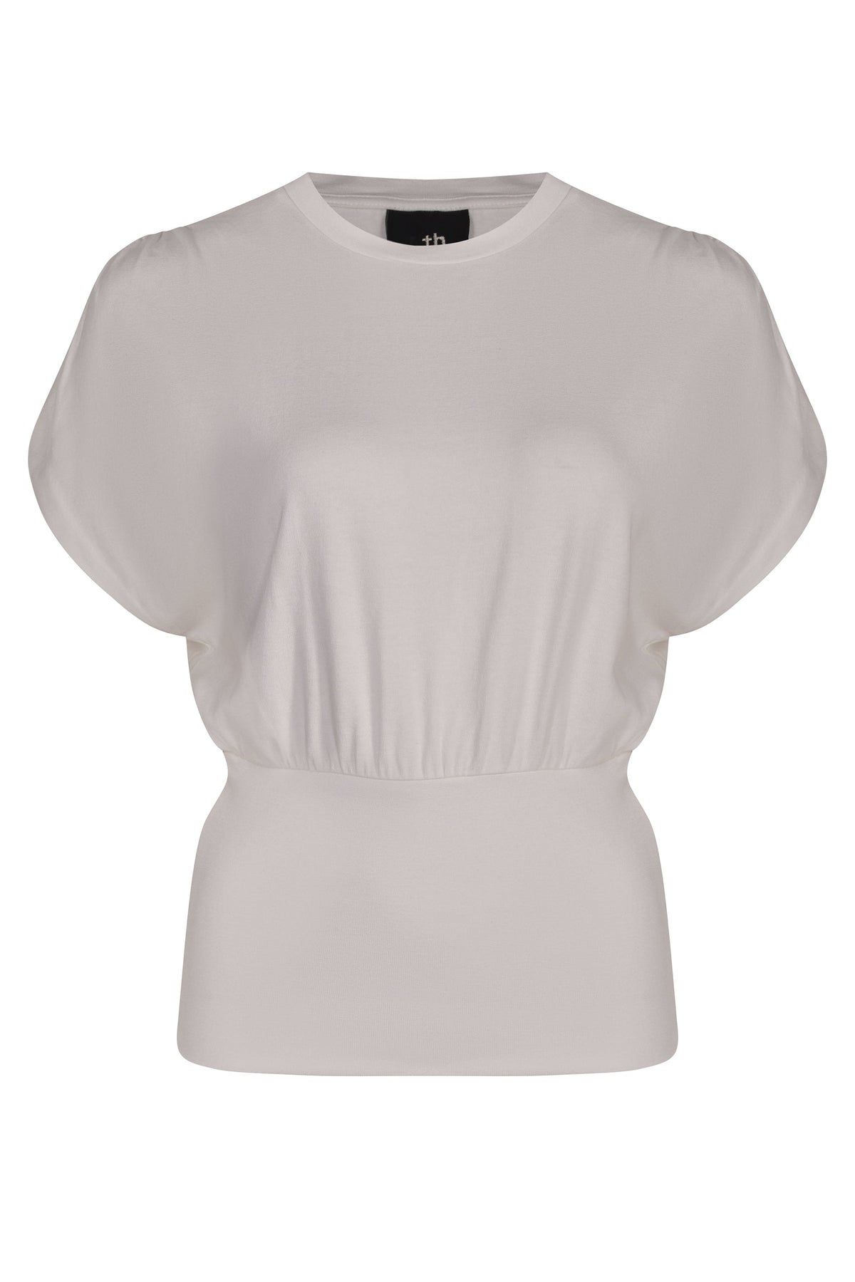 The Thom Krom Wally Top is a crew neck t-shirt shape featuring gathered shoulders, design stitchings and is constructed with a soft and fluffy jersey quality and a tailored rib quality.
