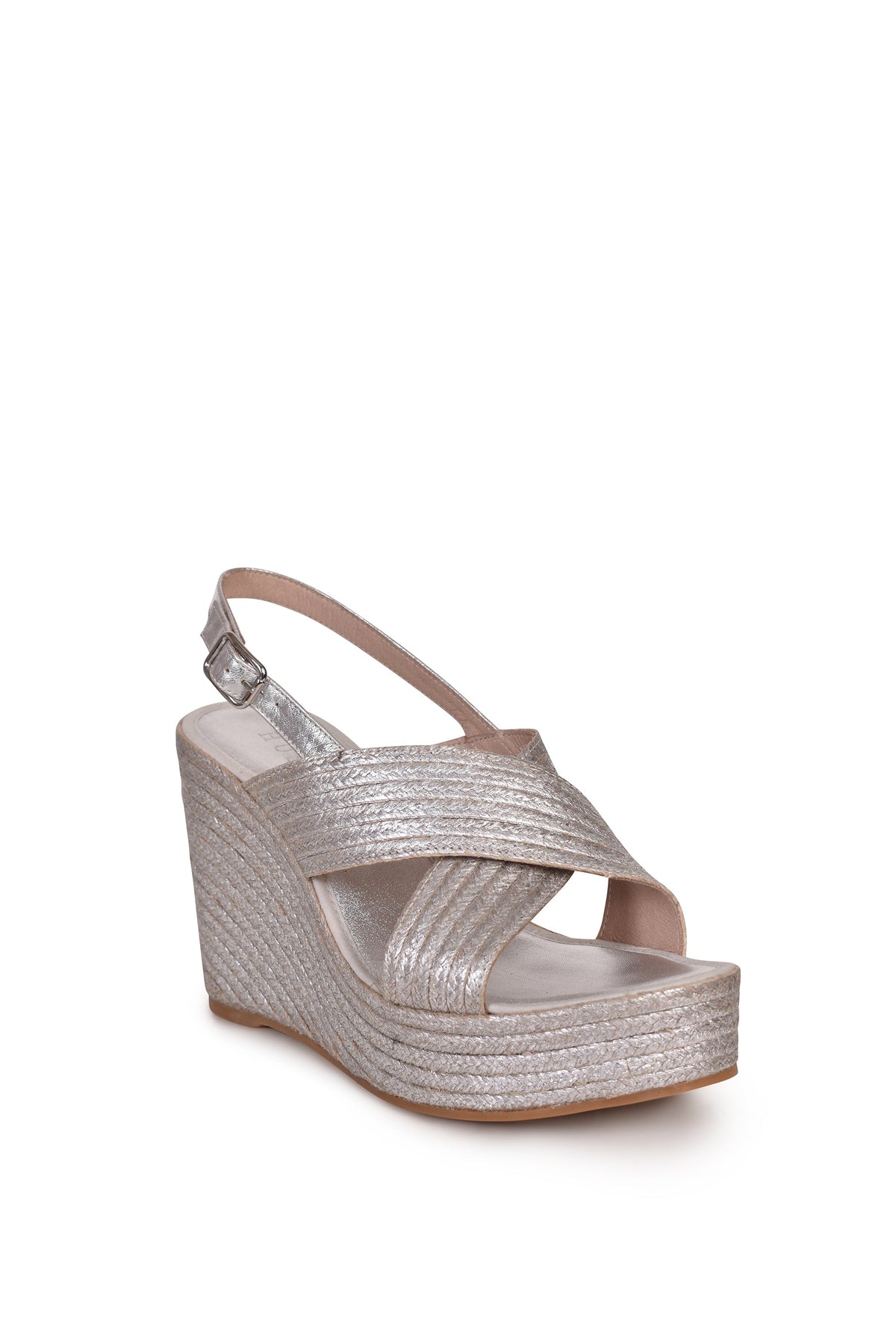 Elevate your style with the Husk MYA ESPADRILLE in silver. The jute upper and classic braided wedge add a touch of luxury to any outfit. With a sleek almond toe shape, leather insole, lining and rubber sole, this shoe is perfect for any occasion.