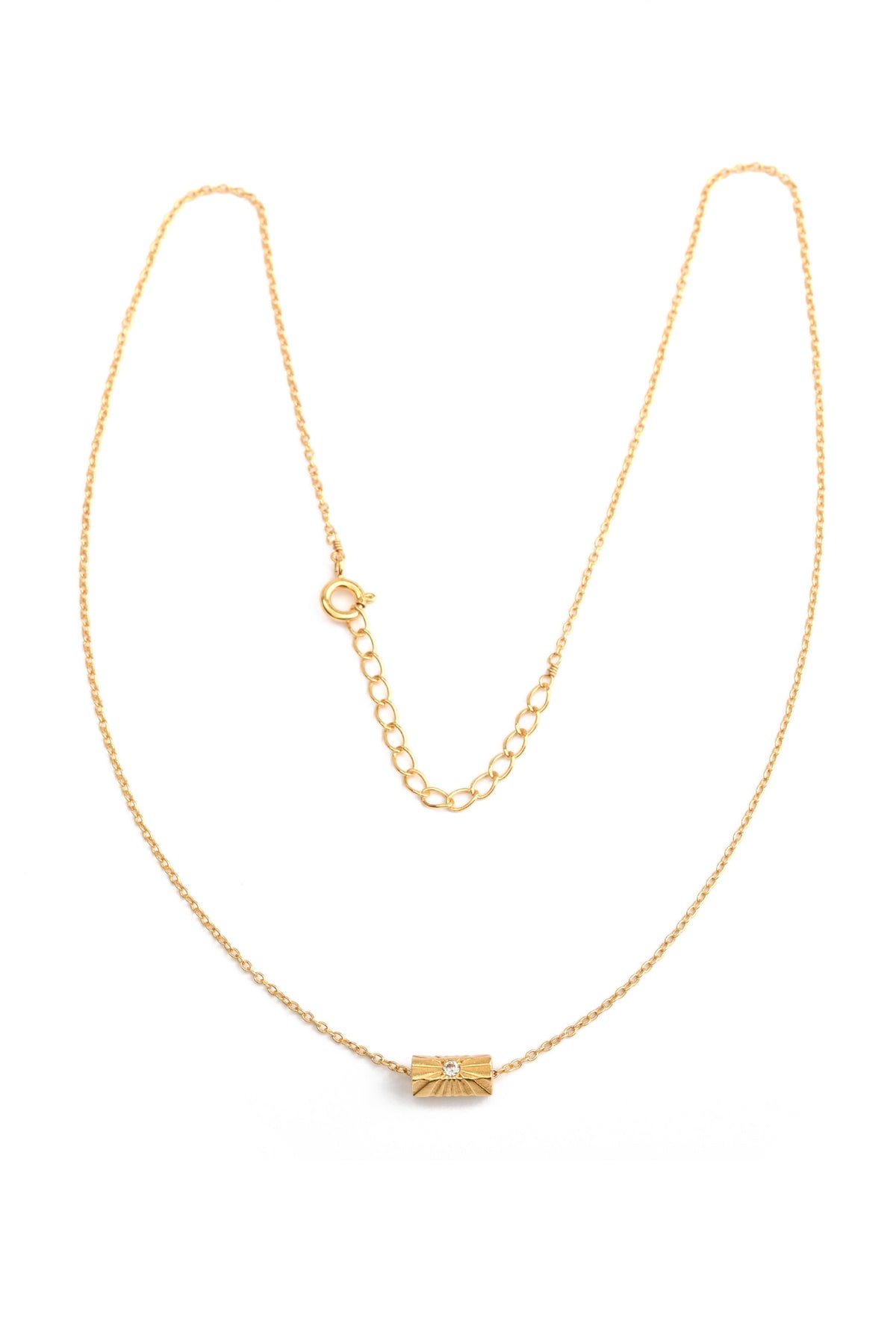 The Husk Kavya Necklace showcases a delicate rectangular bar crafted from luxurious gold plating. Adorned with a sparkling white zircon at its center, this exquisite necklace exudes elegance and sophistication.