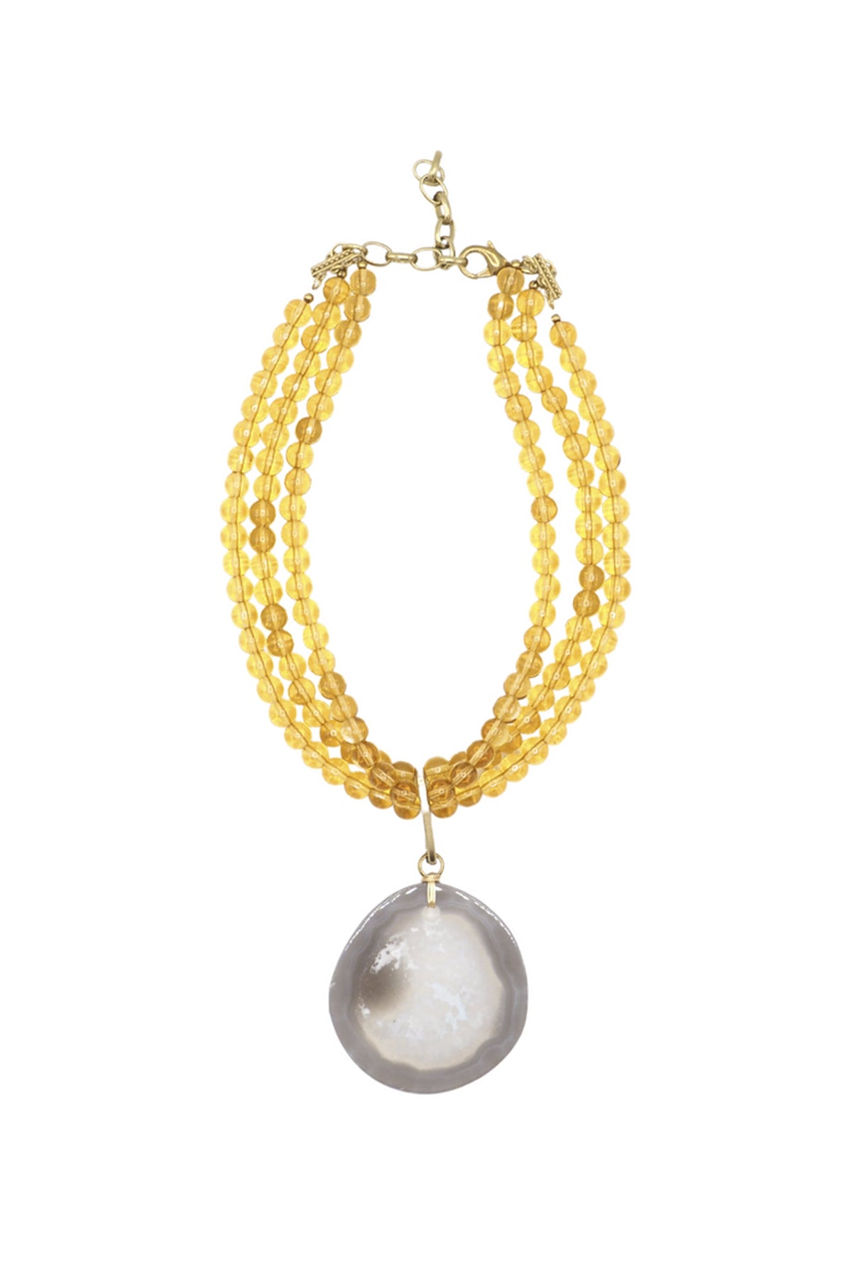 With its several strips of vibrant two tone yellow crystals and a large grey stone pendant, the Sita Nevado Baya Necklace in Lemon exudes luxury and sophistication. Elevate any outfit with this elegant piece that captures the essence of a sunny day at the bay.