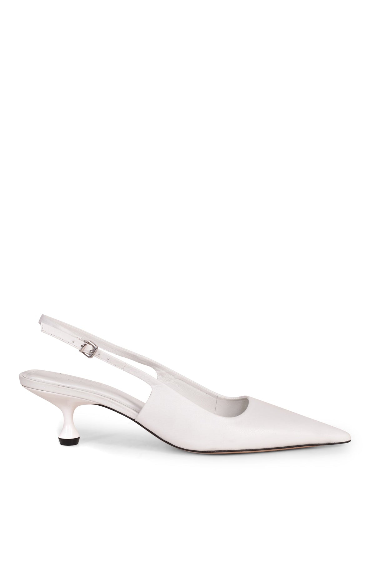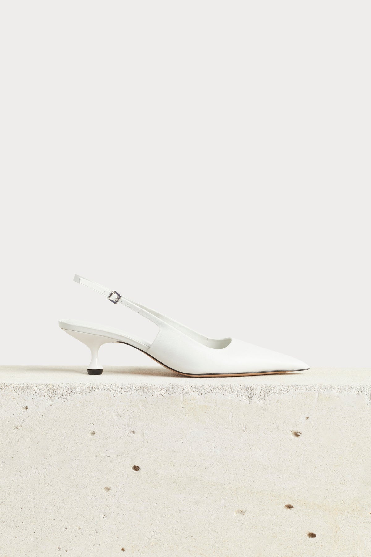 Made in Brazil, this pointed slingback features white leather, a sculptural resin heel, and a leather sock and lining for all-day comfort. Stylish and versatile, it adds a modern edge to any outfit.