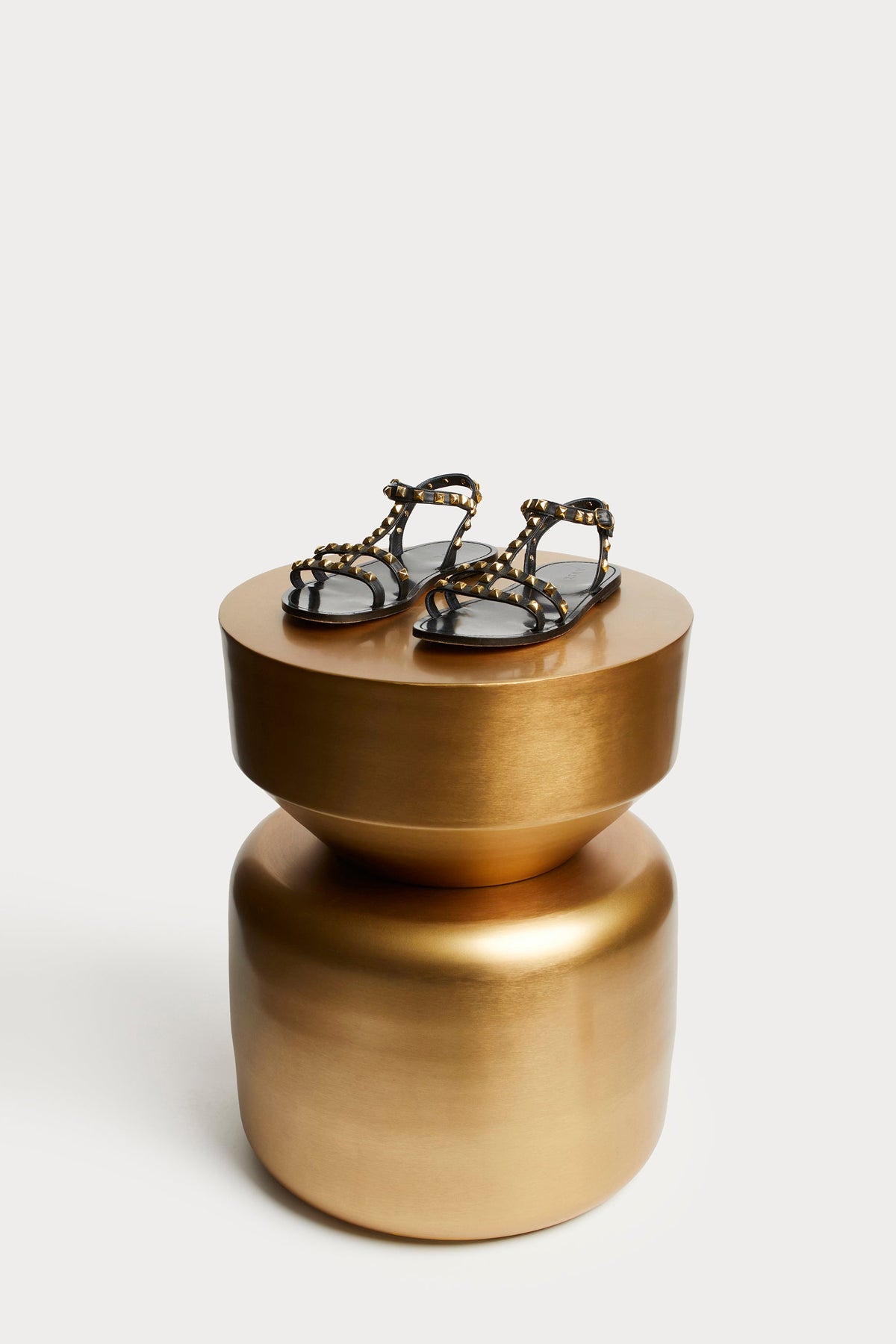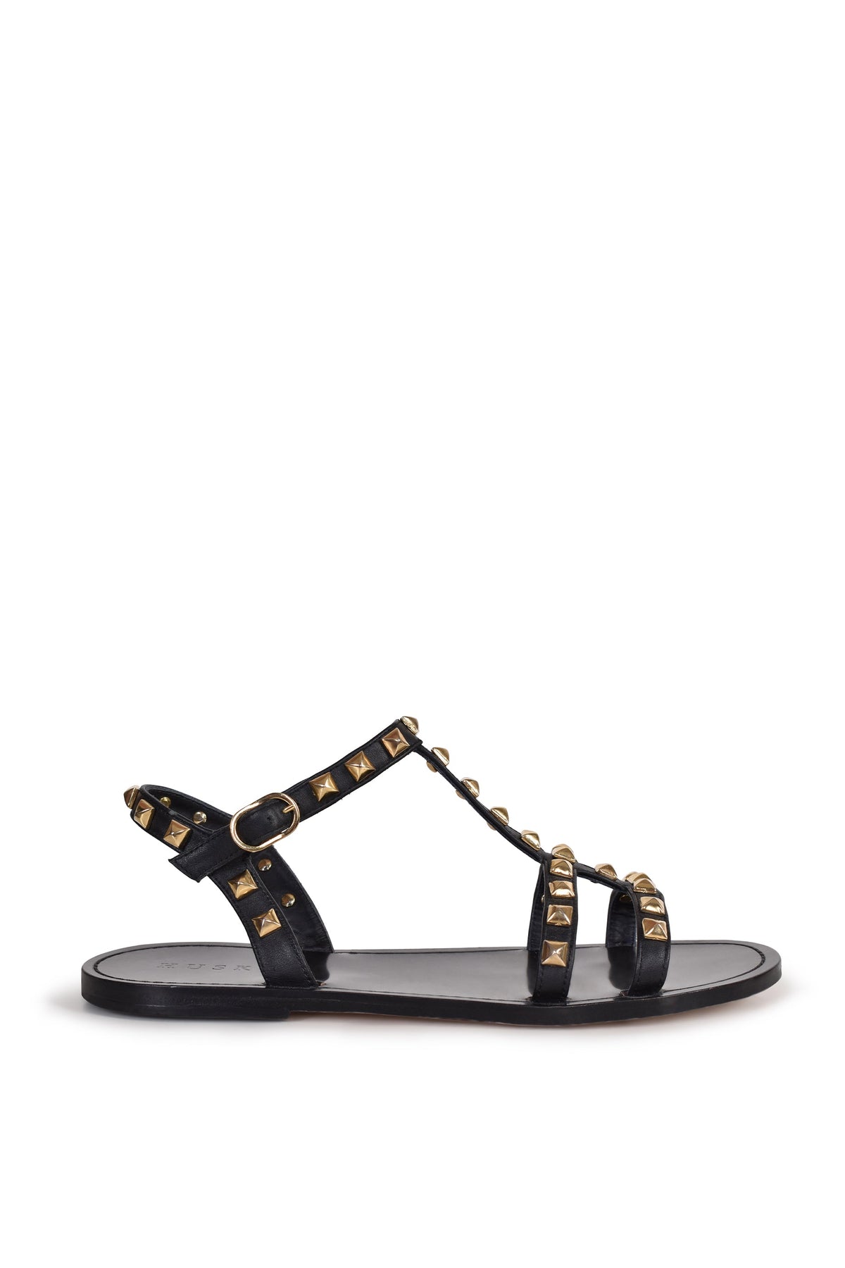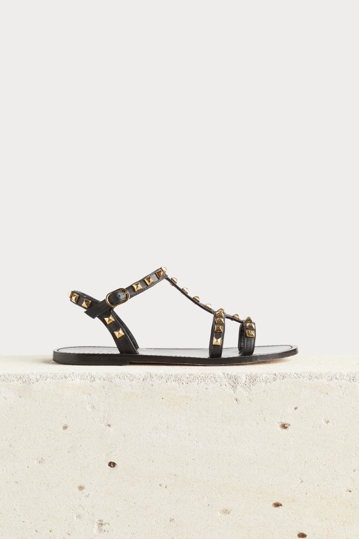 Elevate your style with the Husk Ingrid Flat in black. Crafted with a luxurious leather upper and adorned with brushed gold pyramid studs, these gladiator-style flats exude sophistication. The almond toe shape and buckle-fastening ankle strap add a touch of elegance, while the leather insole and sole provide comfort and durability. Step into luxury with these exclusive flats.