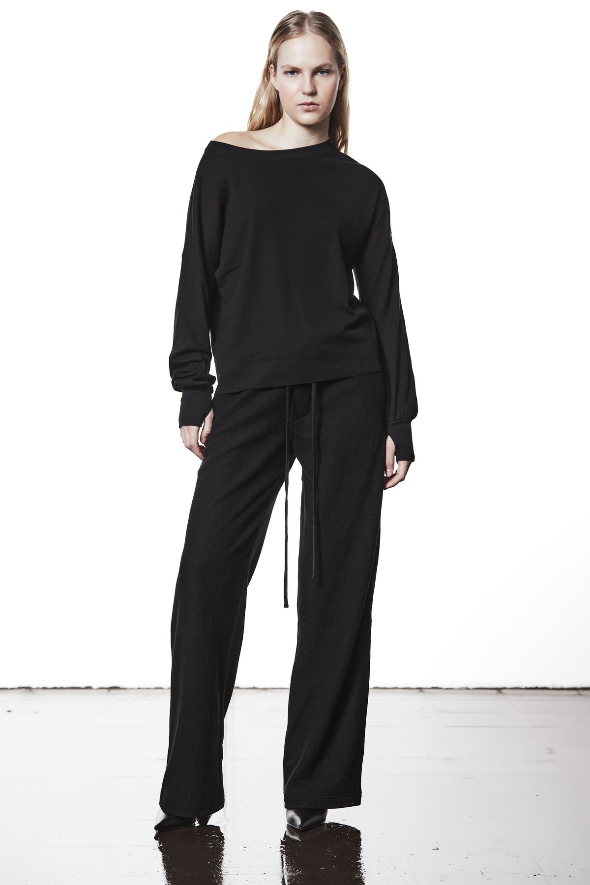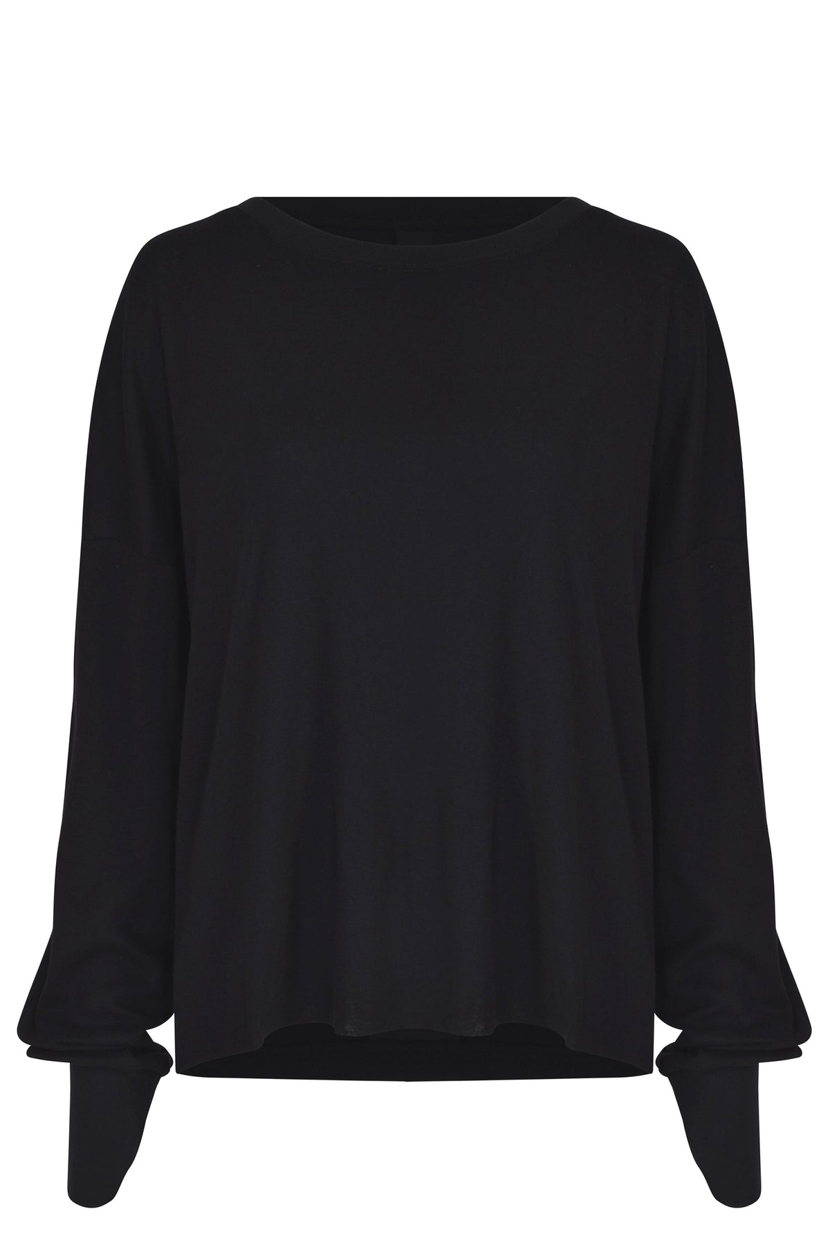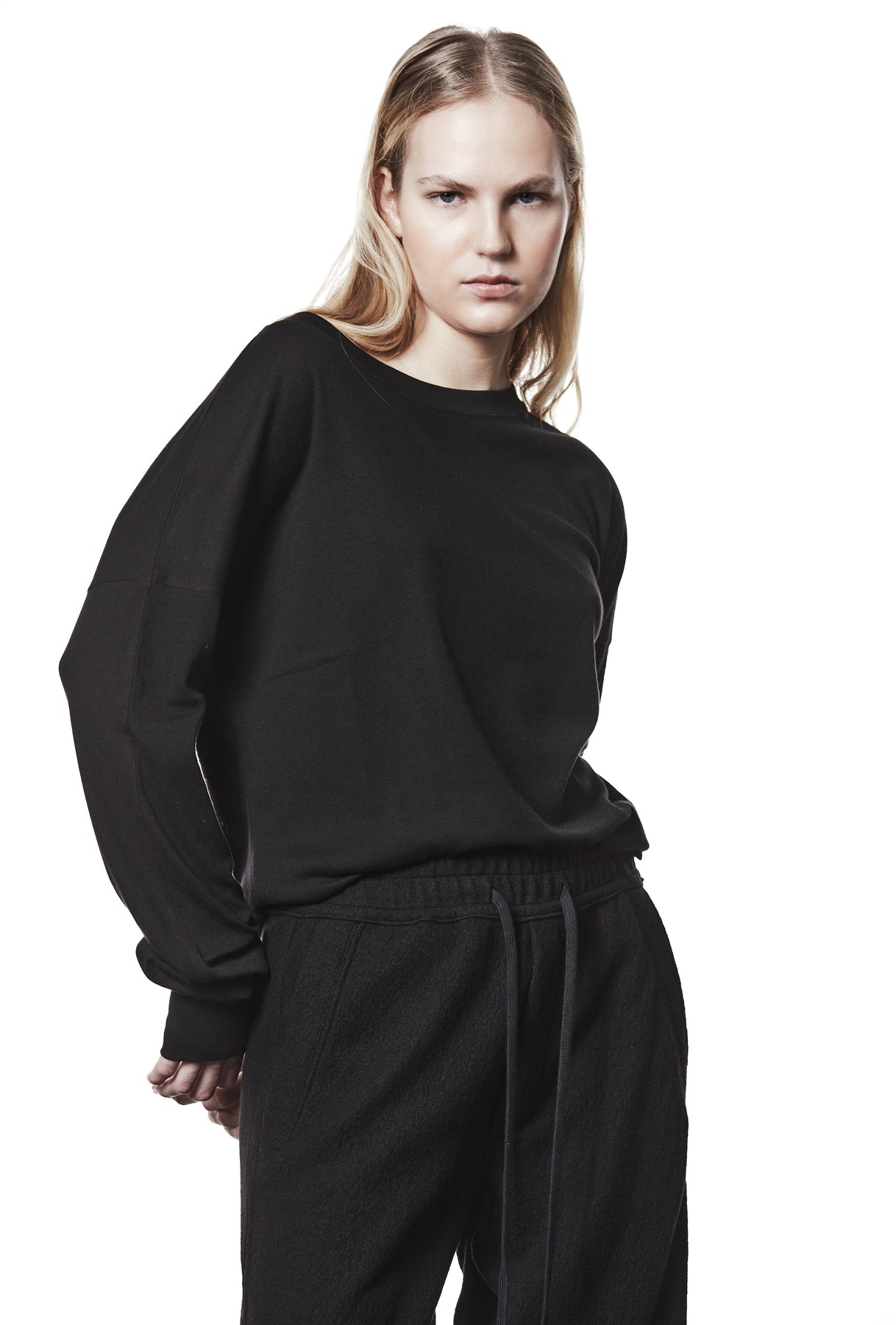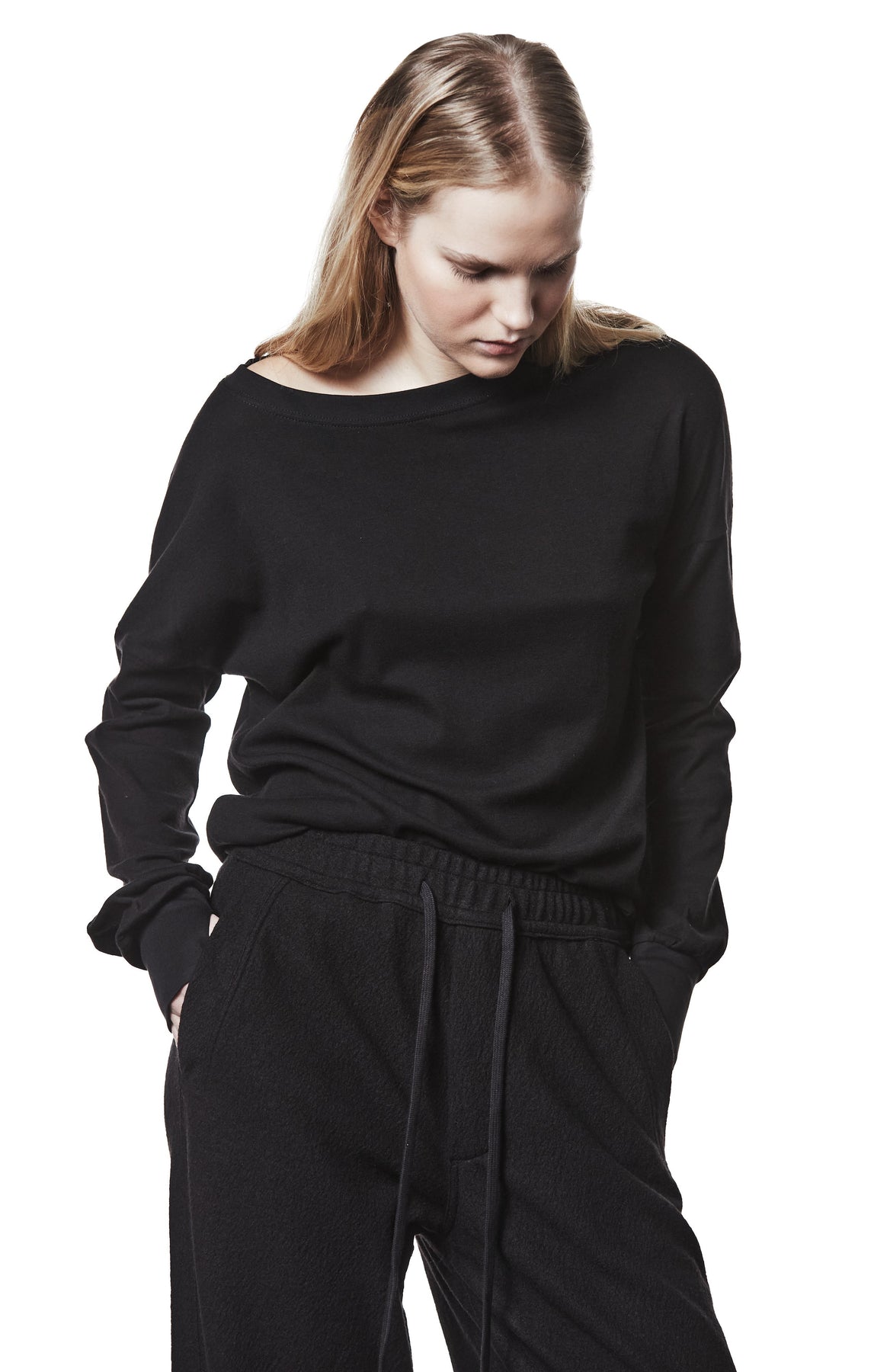 The Thom Krom Logo Longsleeve in Black features a relaxed fit with a boat neck and drop shoulders for a modern, effortless silhouette. Crafted from a soft cotton-wool blend, it offers comfort and warmth. Long sleeves include thumbholes for added functionality, while a small embroidered slogan adds a subtle, sophisticated detail.