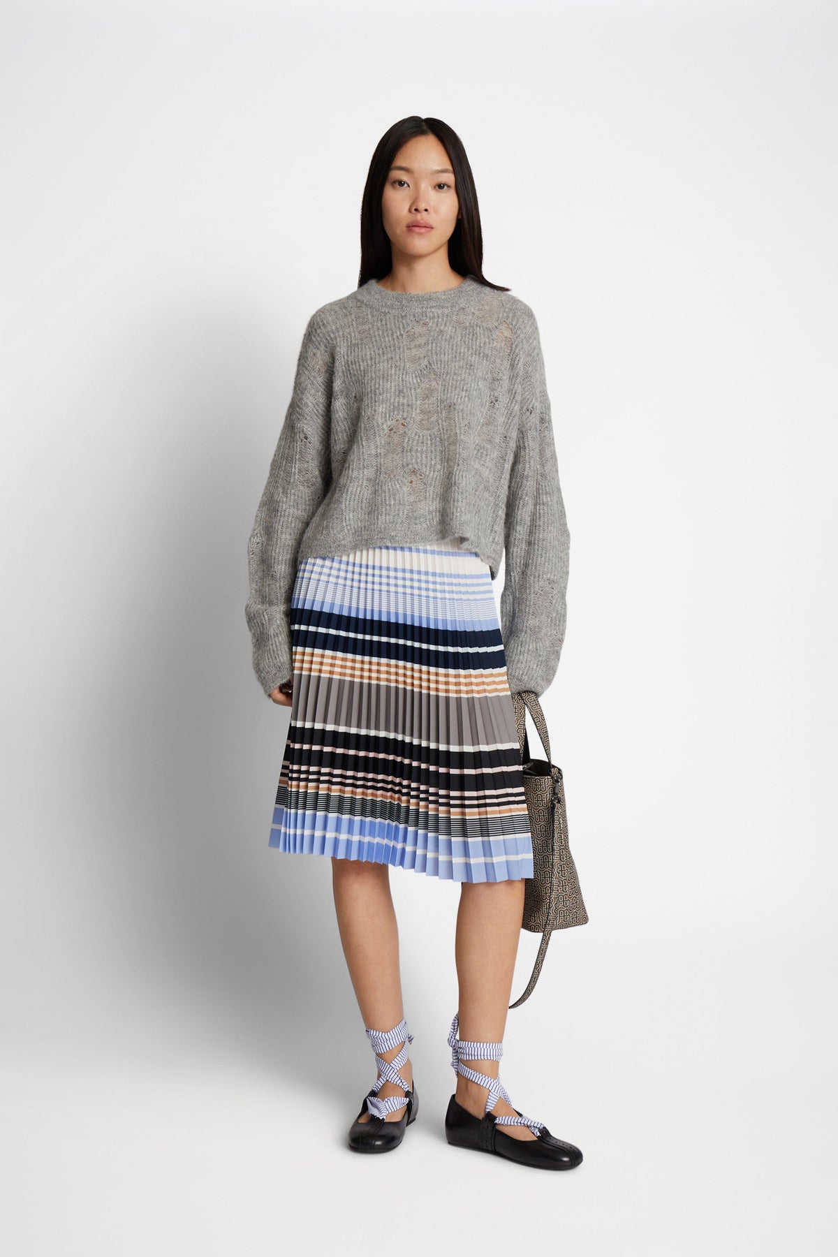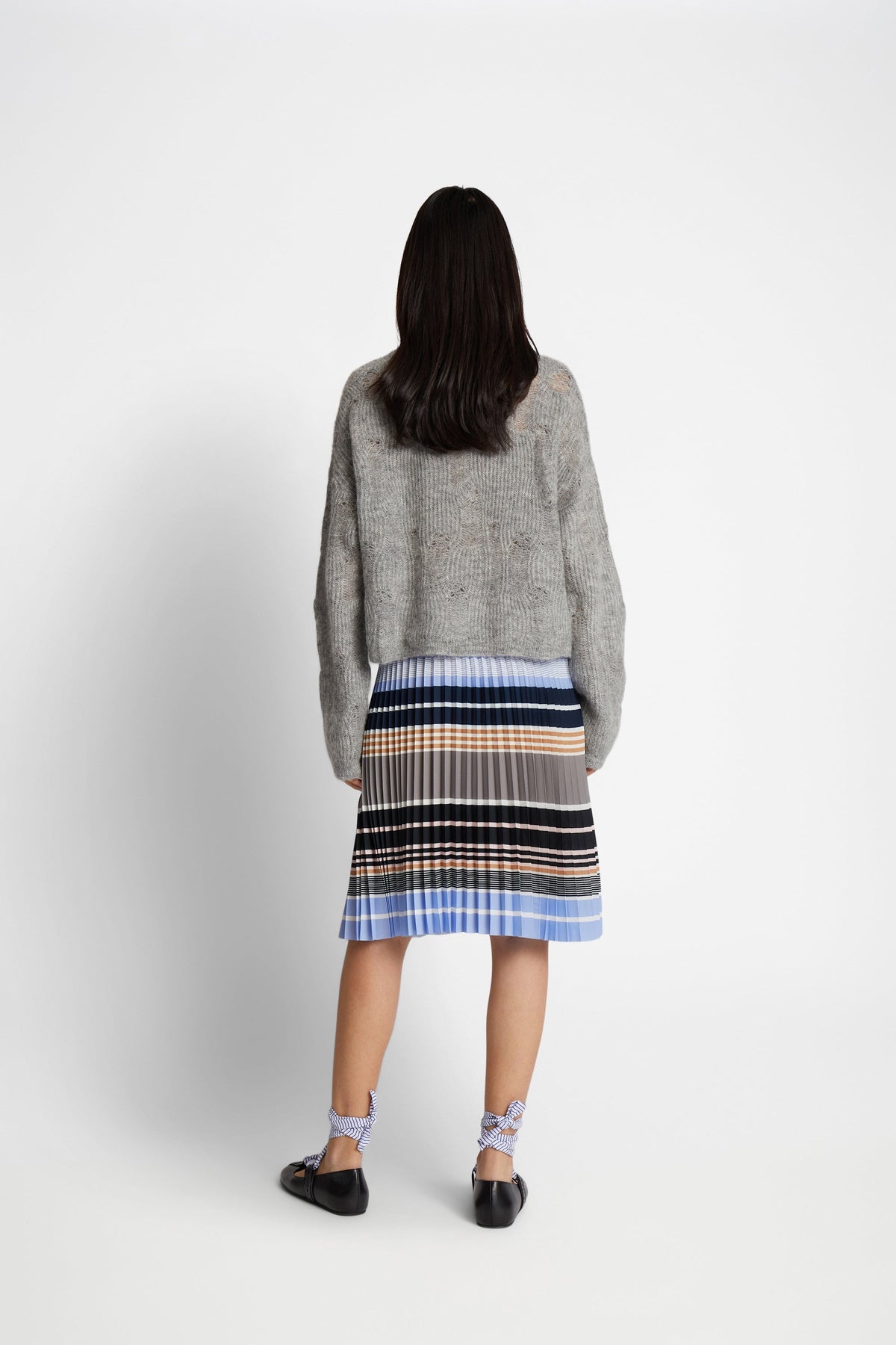 A short pleated skirt with an elegant striped pattern, and an elastic band at the waist. This skirt is made from a recycled polyester blend, and has a loose fit.