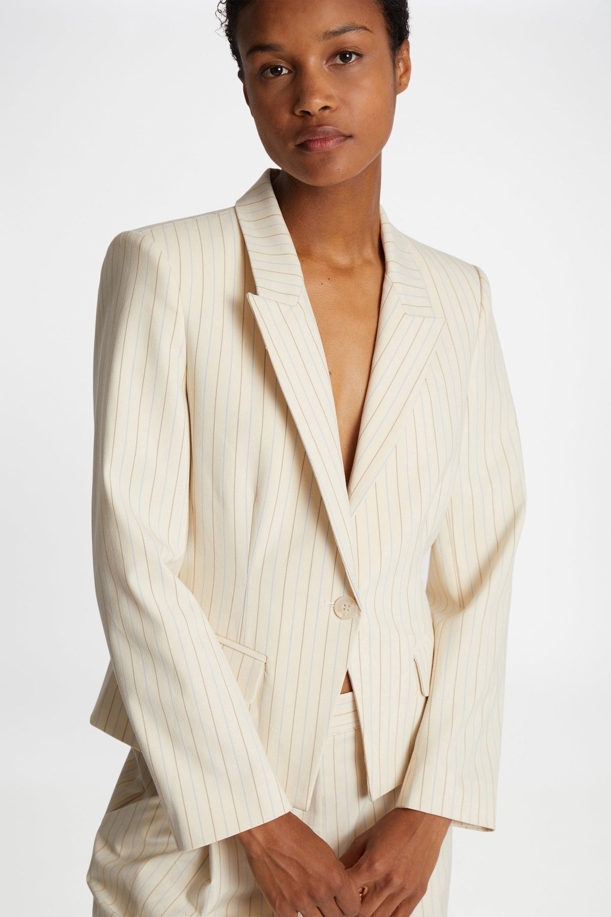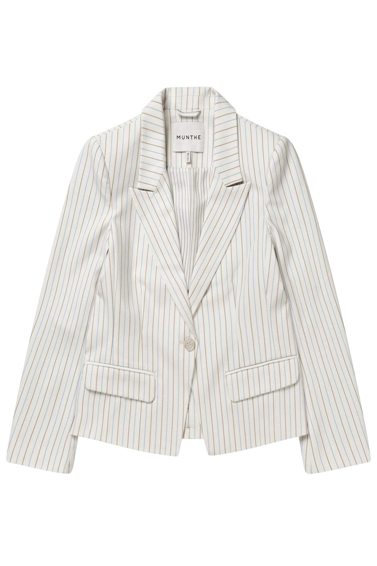 The Munthe Fanya Blazer is a sophisticated piece designed for the modern woman. It features a pinstripe design and a button closure in the front for a touch of luxury.