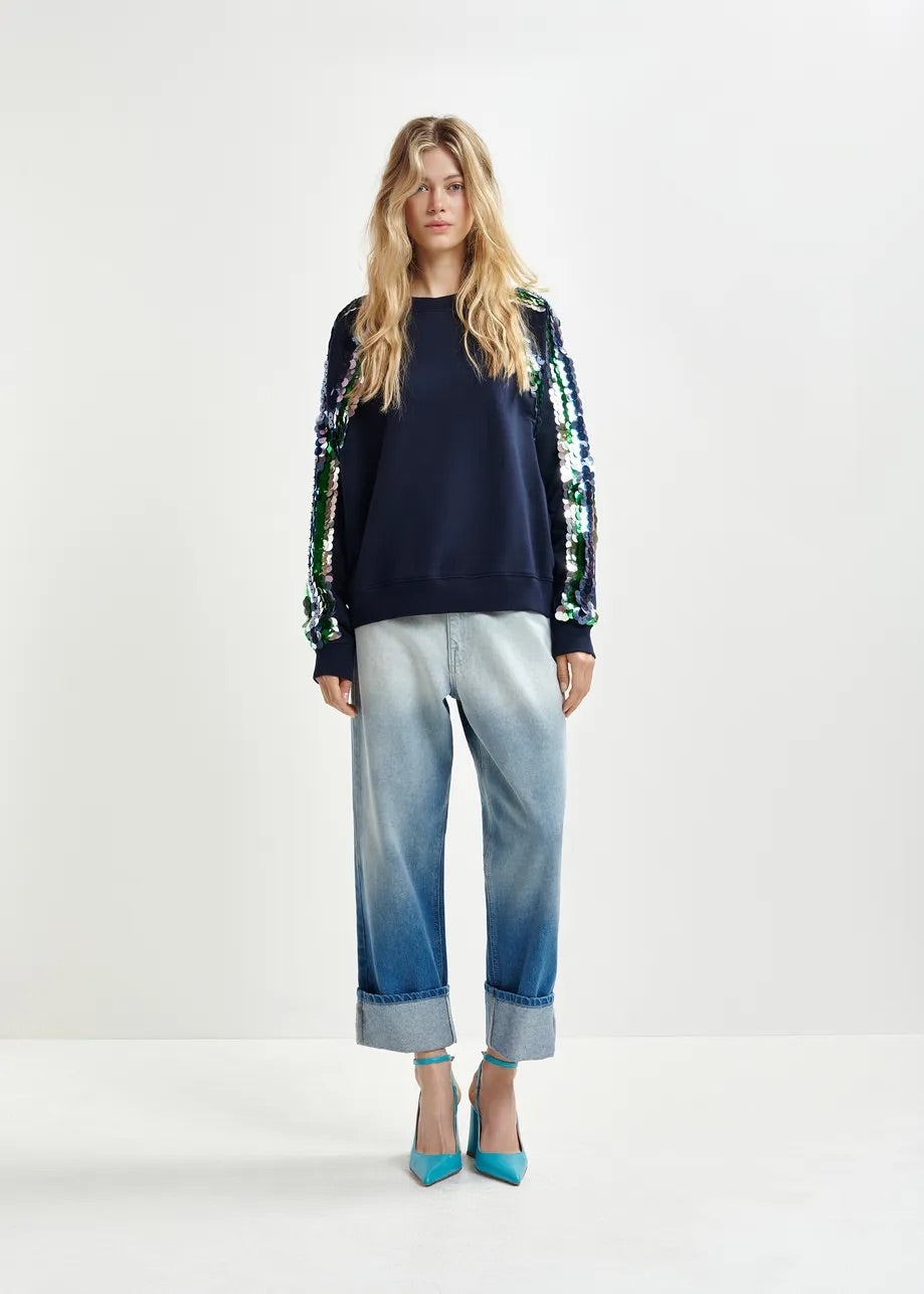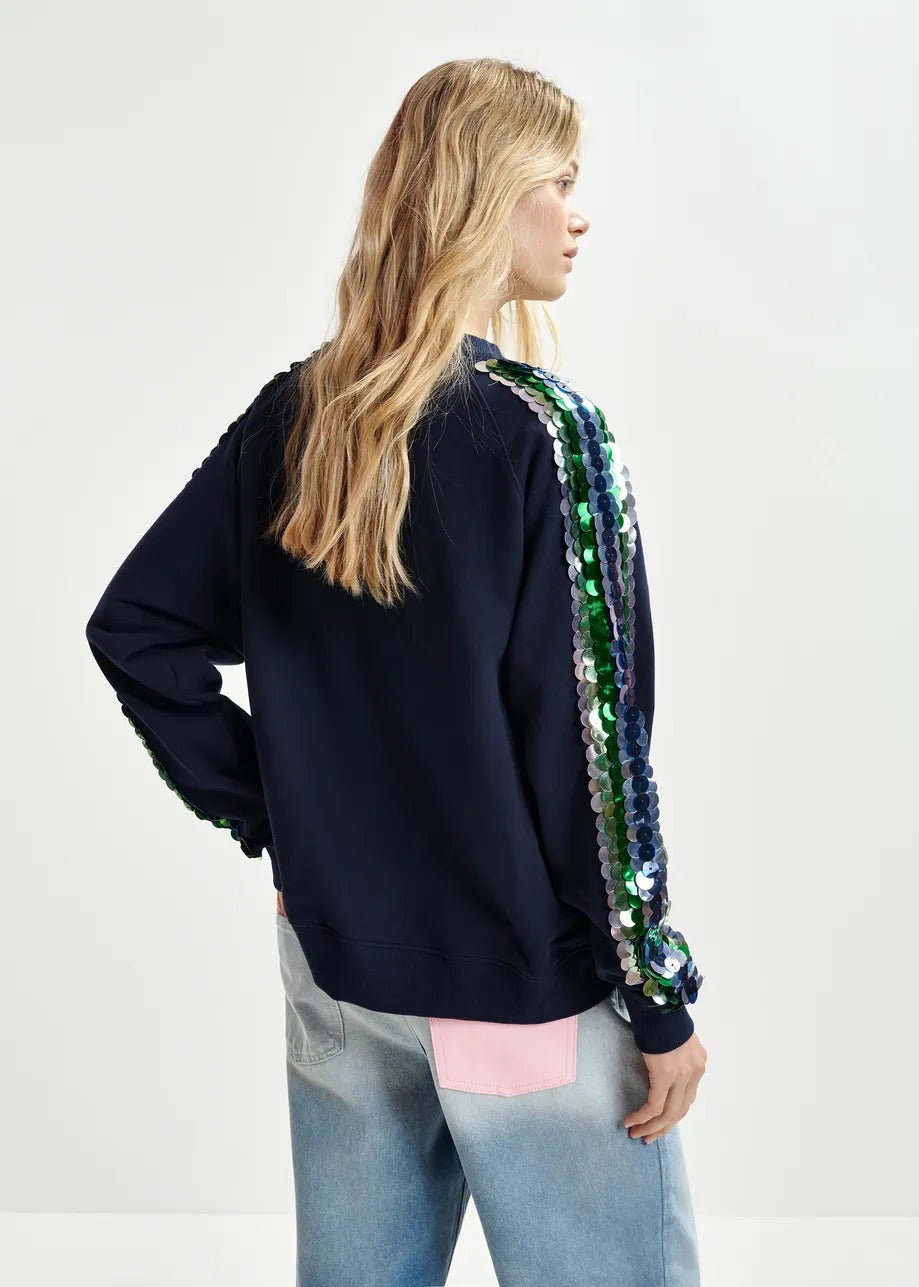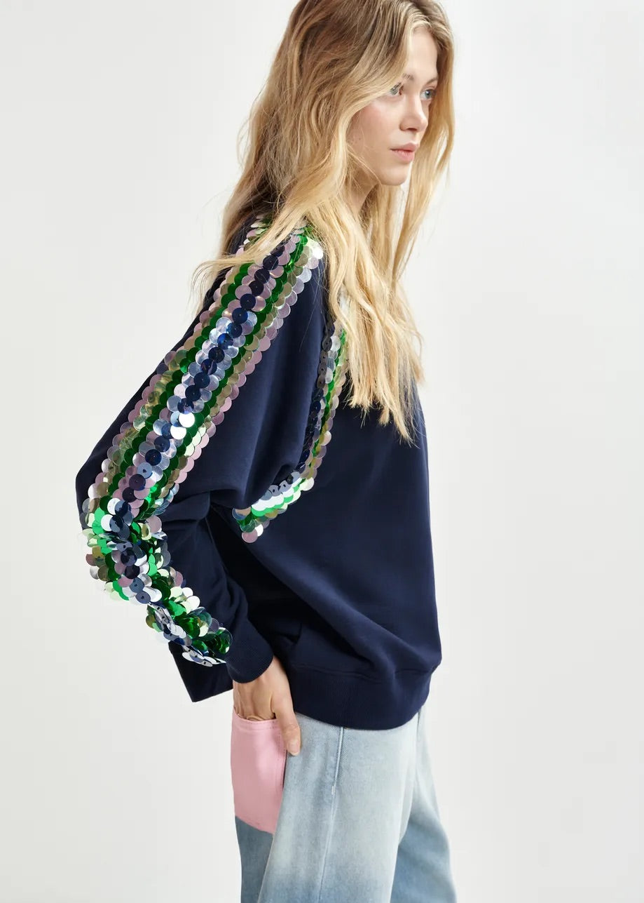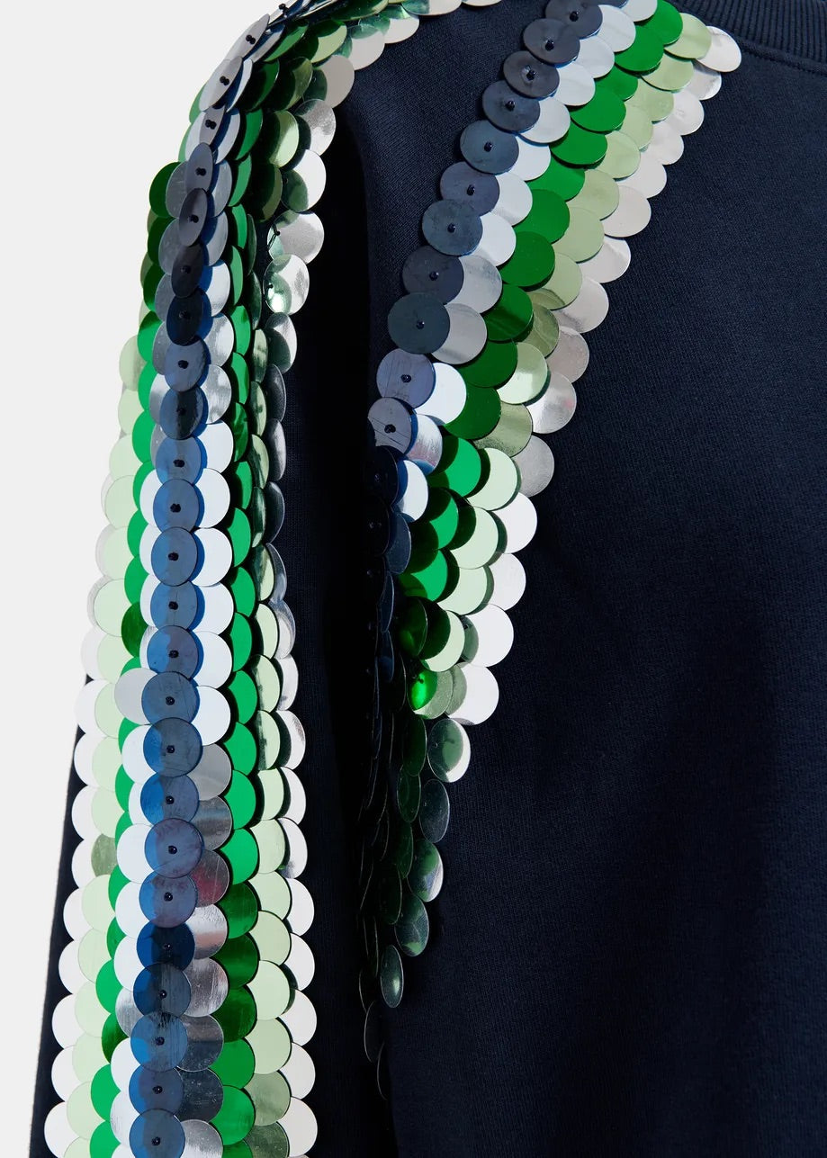 Soft organic cotton-jersey sweatshirt has a relaxed fit. The sleeves have been boldly detailed with rows of sequins and beads.