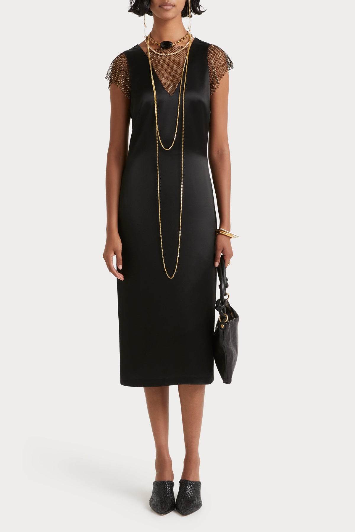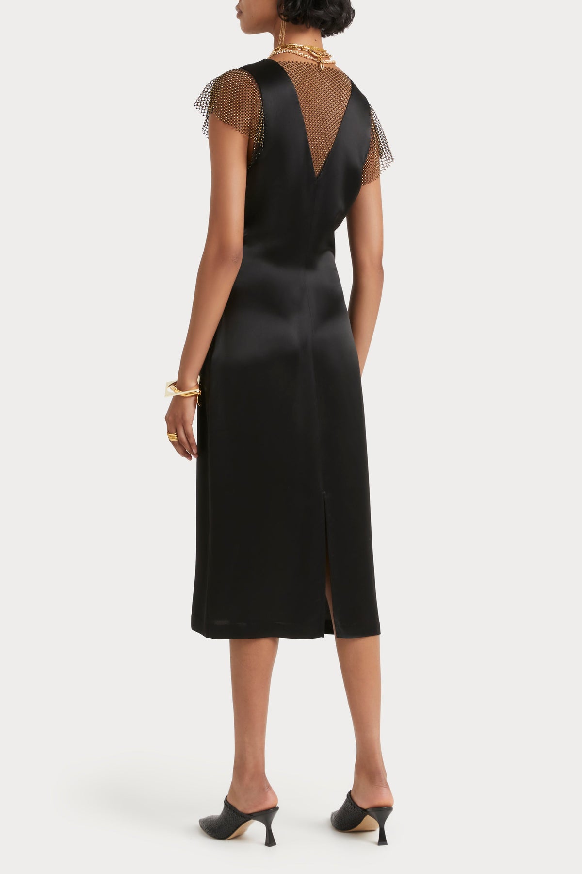 - Cut in a Acetate/Poly blend with chainmail gold stone contrast - Midi length