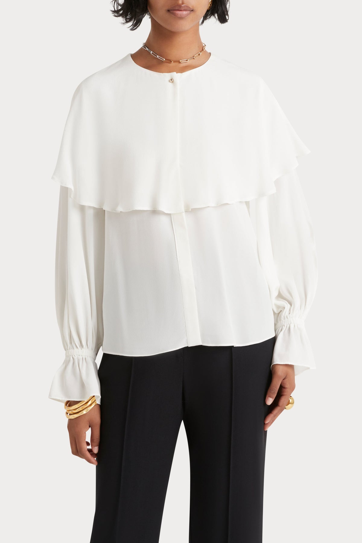 - Concealed placket with gold button at neckline