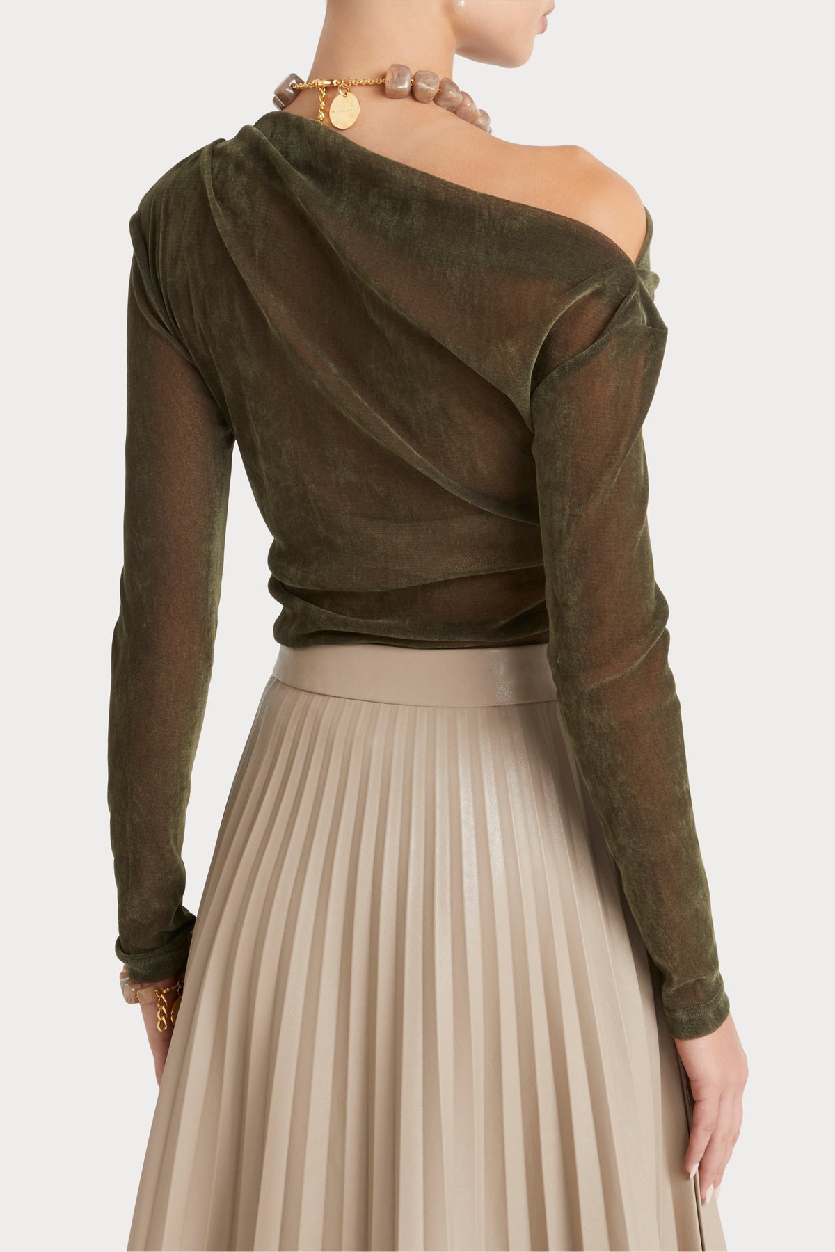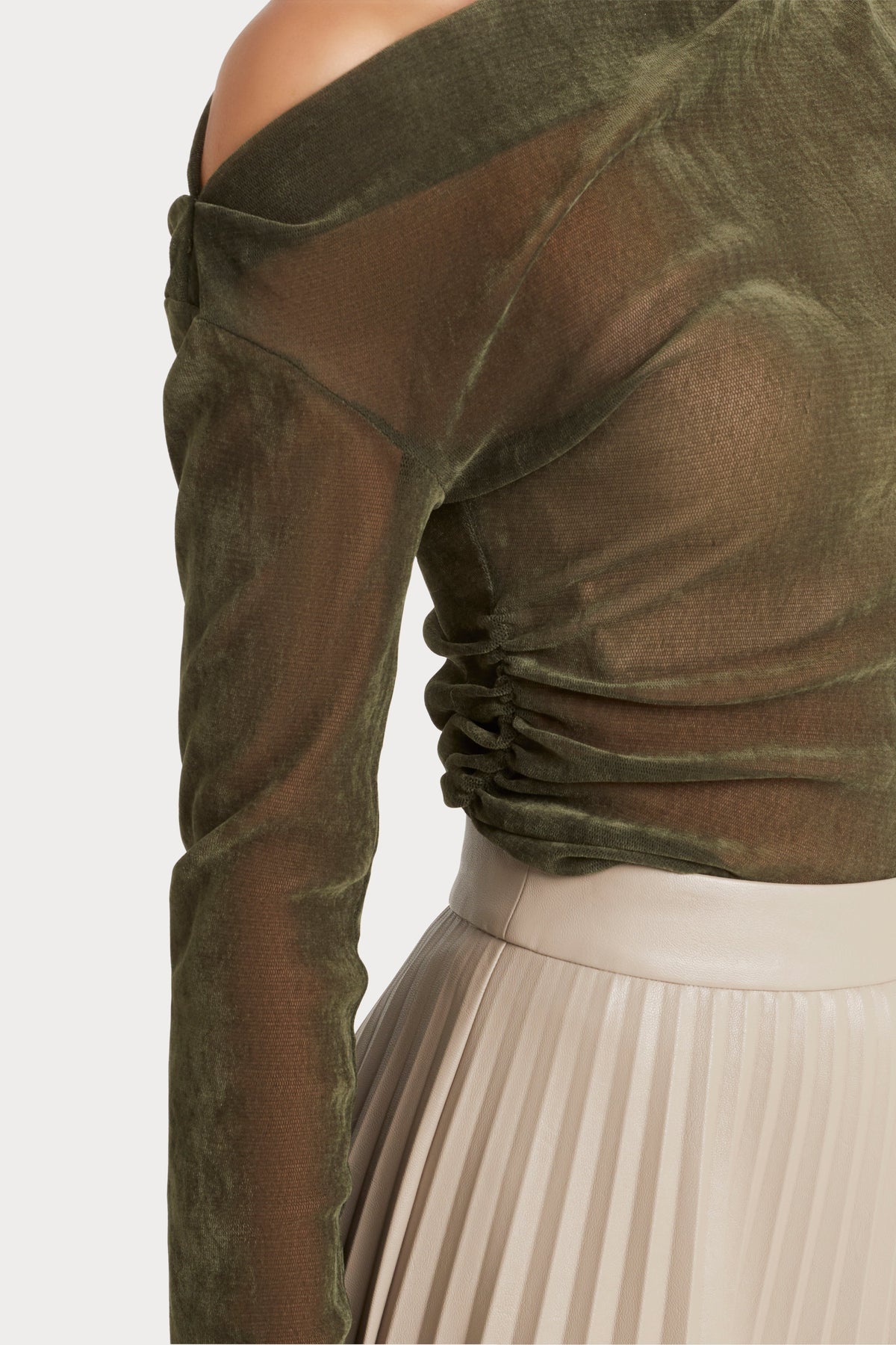 - Slim fit flocked mesh top- Asymmetric, off the shoulder neckline- Long slim sleeve- Side seam gathers