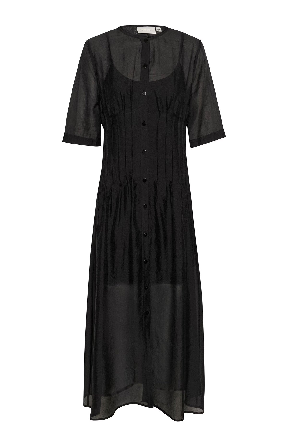 Flowy midi dress with a sheer overlay and button-down front. Features elbow-length sleeves and a flattering silhouette with soft gathering for added shape and comfort.