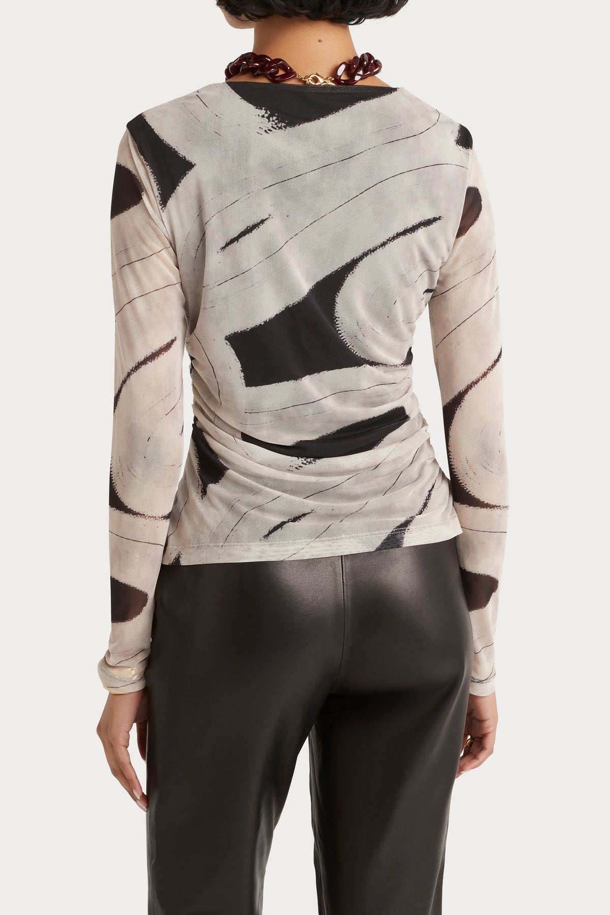 This refined Husk Medusa Top is crafted from soft mesh and features a classic crew neckline. It is fully lined for added comfort and has fitted long sleeves. Subtle gathers at the waist and shoulders enhance its silhouette, with a flattering hip-length cut.