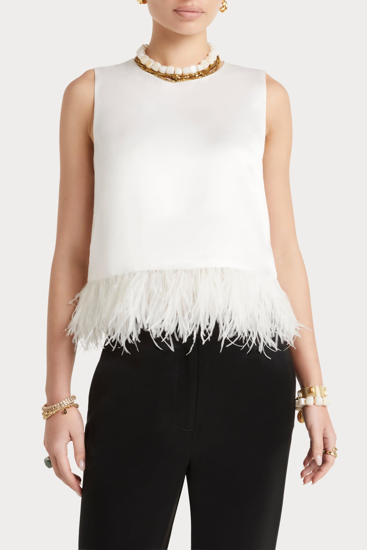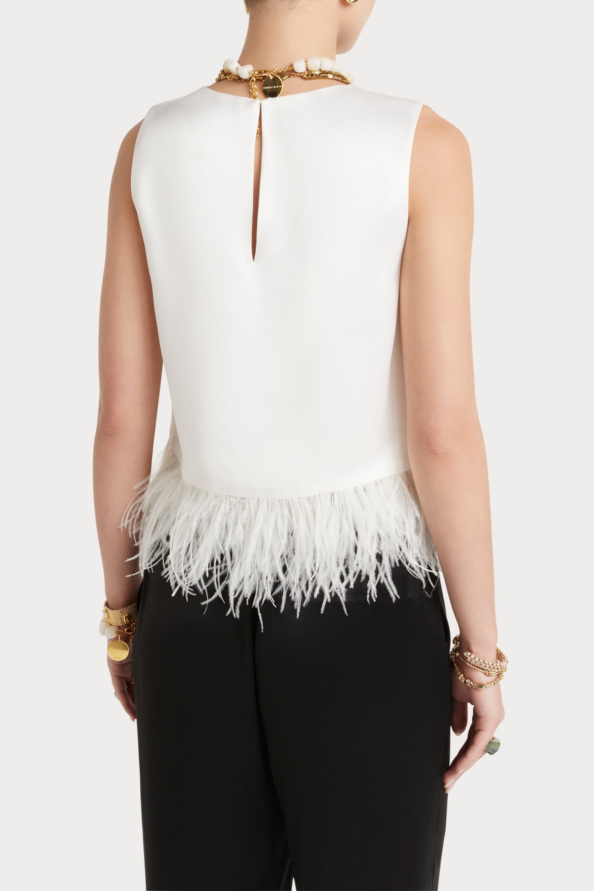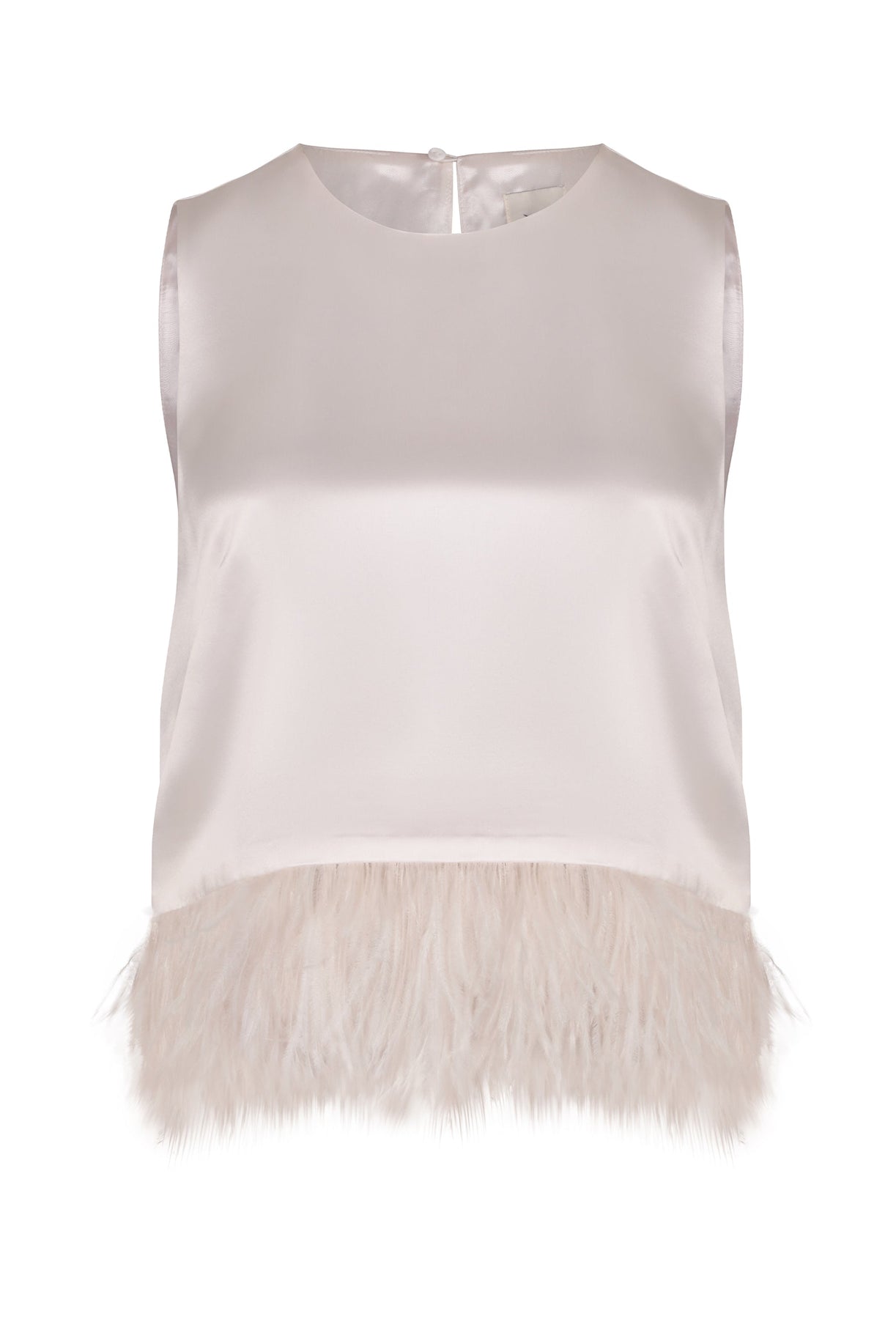- Sleeveless feather top- Regular boxy fit- Back keyhole opening with button- Feather hem trim- Cropped length