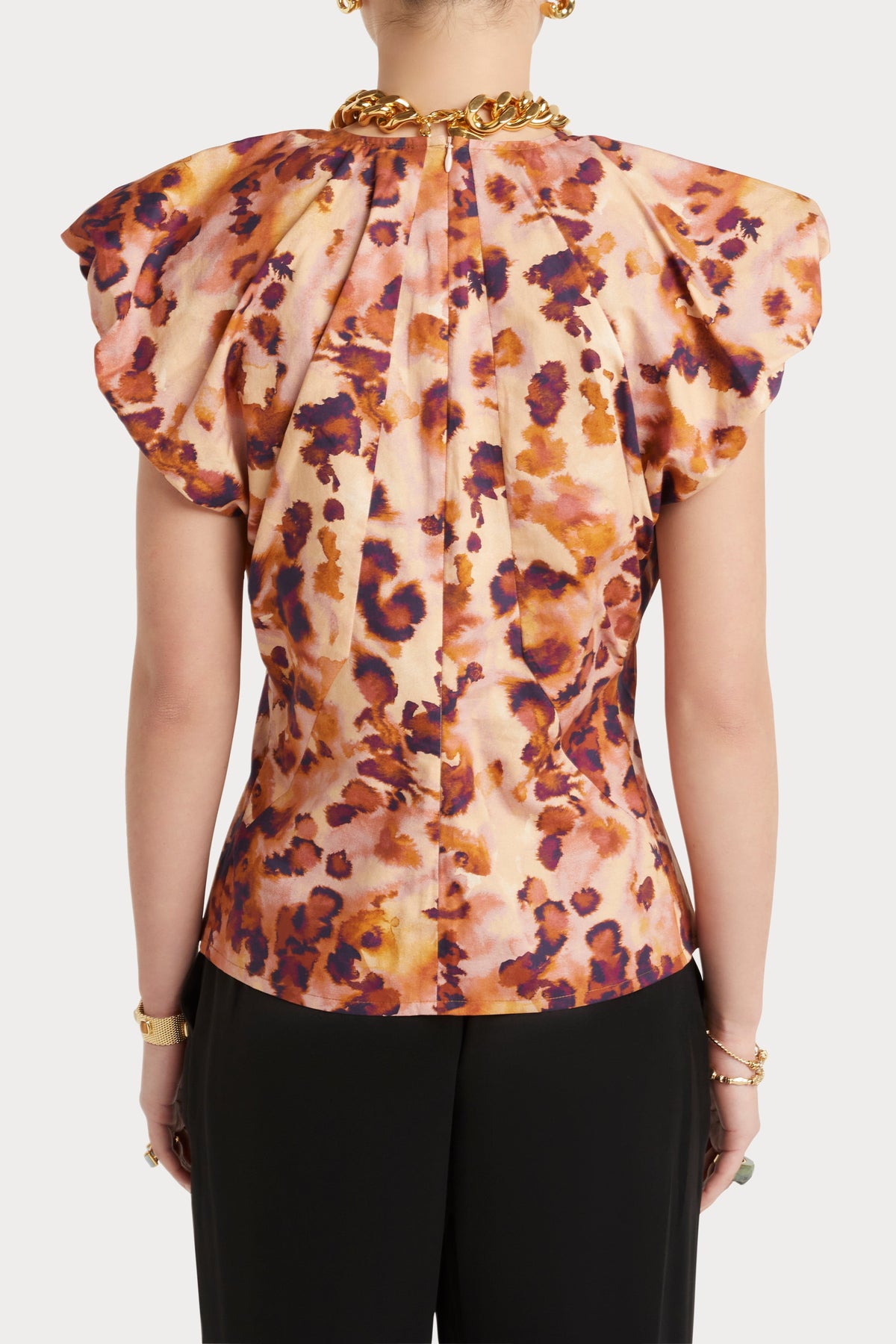 - Wide flutter cap sleeve with fullness