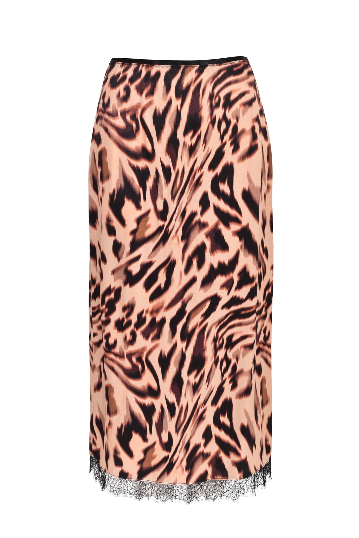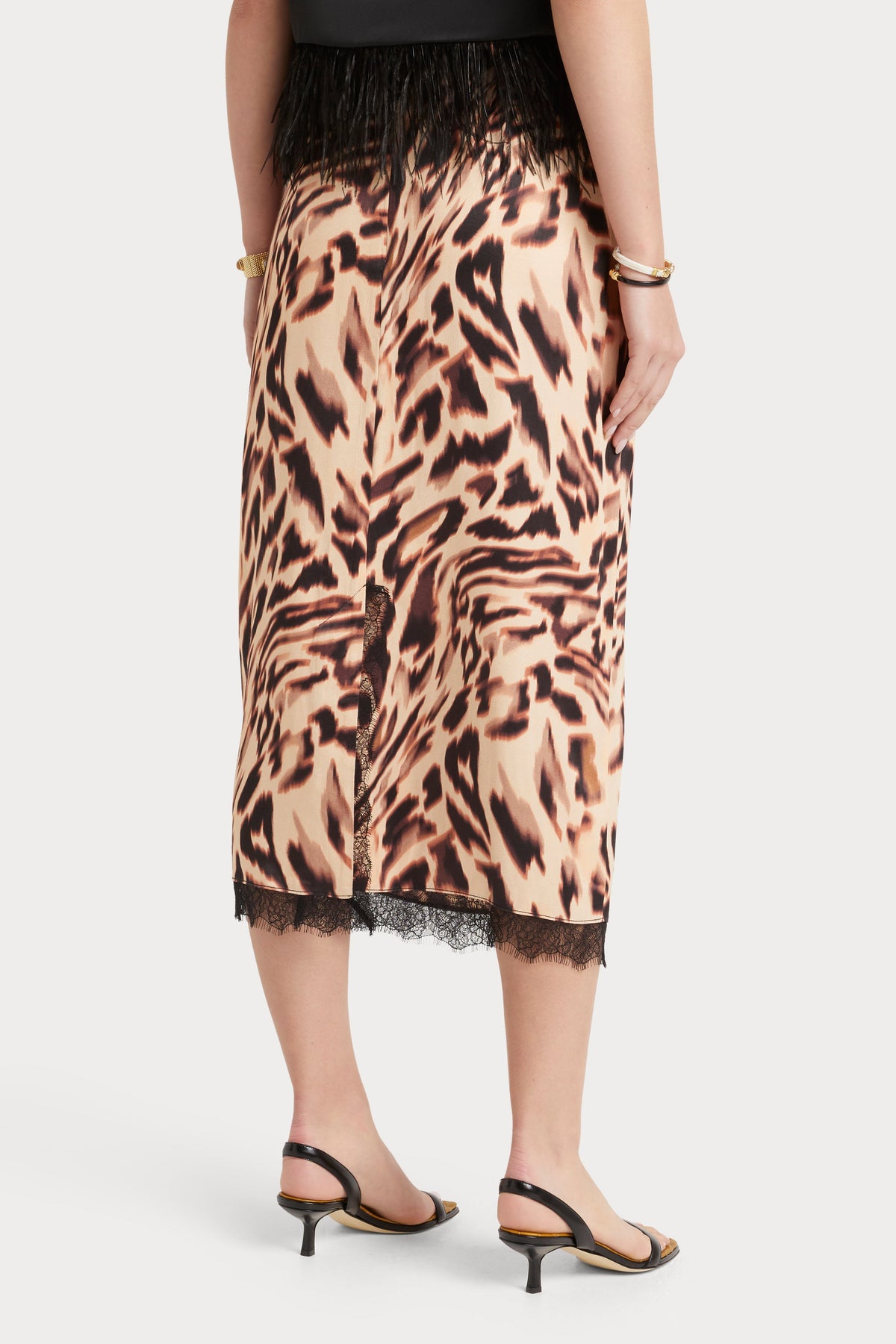 - Printed Viscose satin- Drop waist skirt- Midi length- Contrast black lace trim at hem and back split