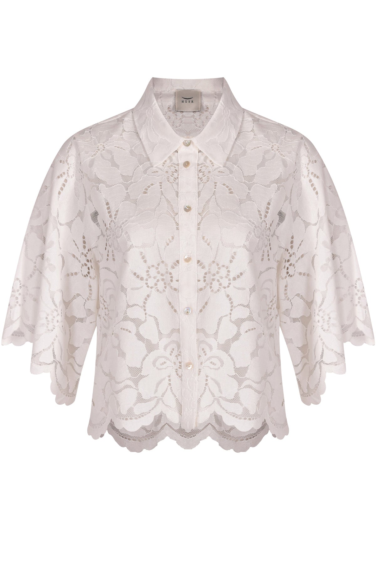The Allegra Shirt is a lightweight lace shirt, blending modern ease with delicate feminine detail.
