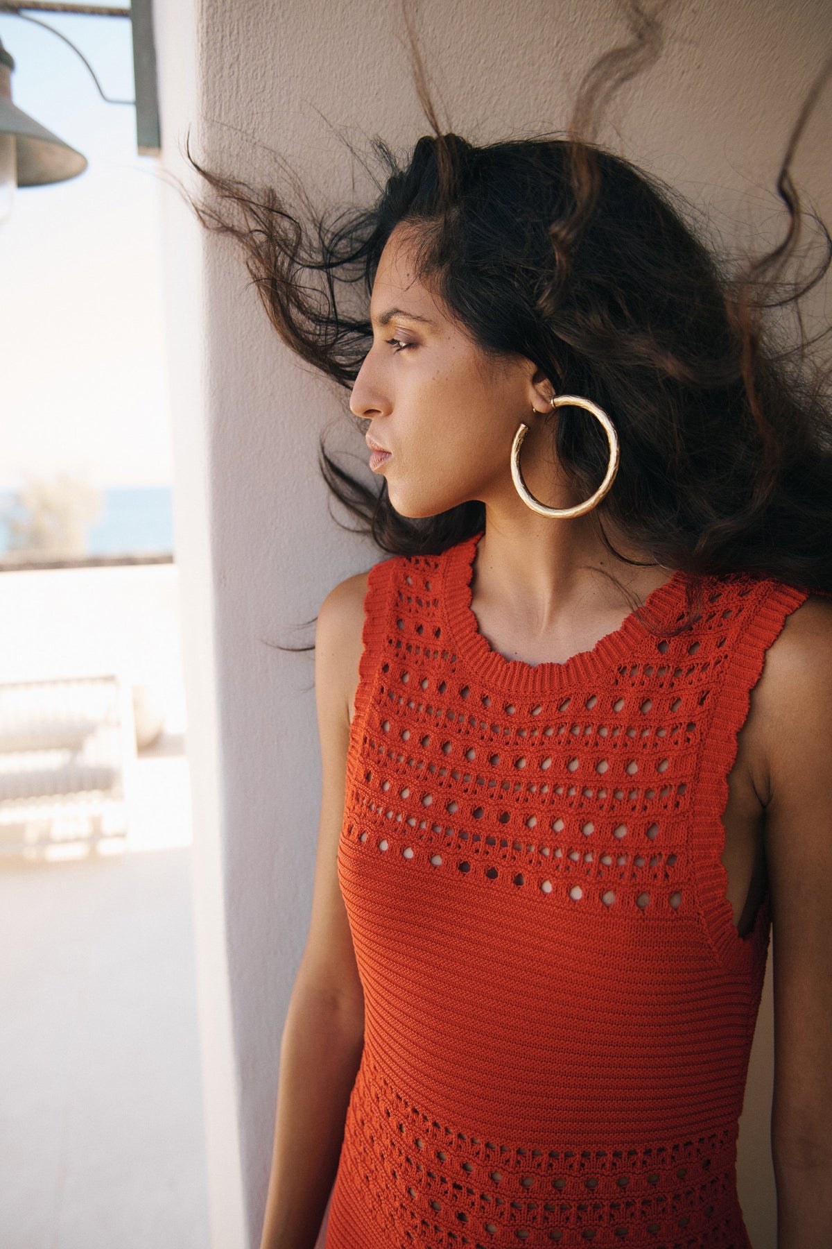 The Gaia Dress is a breezy silhouette designed in a cotton-nylon blended crochet balancing texture with comfort for everyday wearability.