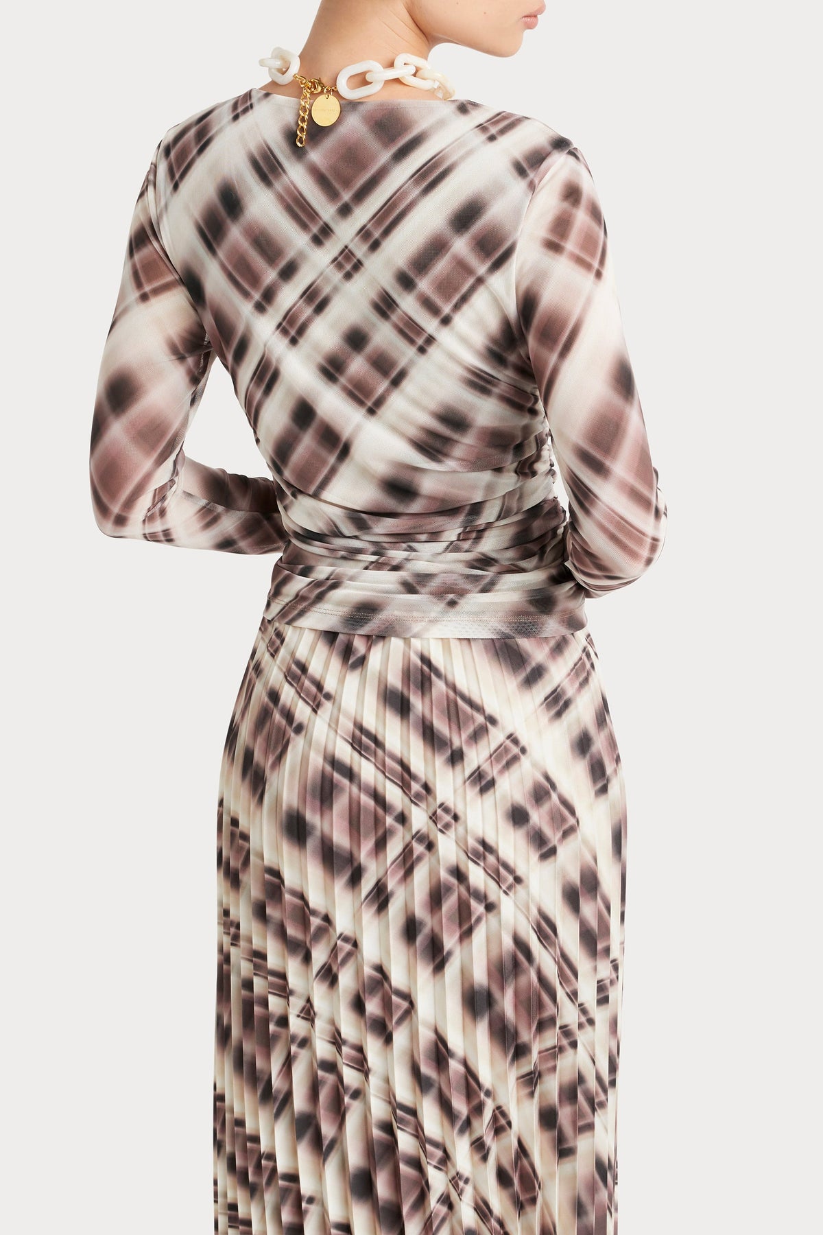 Is crafted from soft mesh and features a classic crew neckline. It is fully lined for added comfort and has fitted long sleeves. Subtle gathers at the waist and shoulders enhance its silhouette, with a flattering hip-length cut.