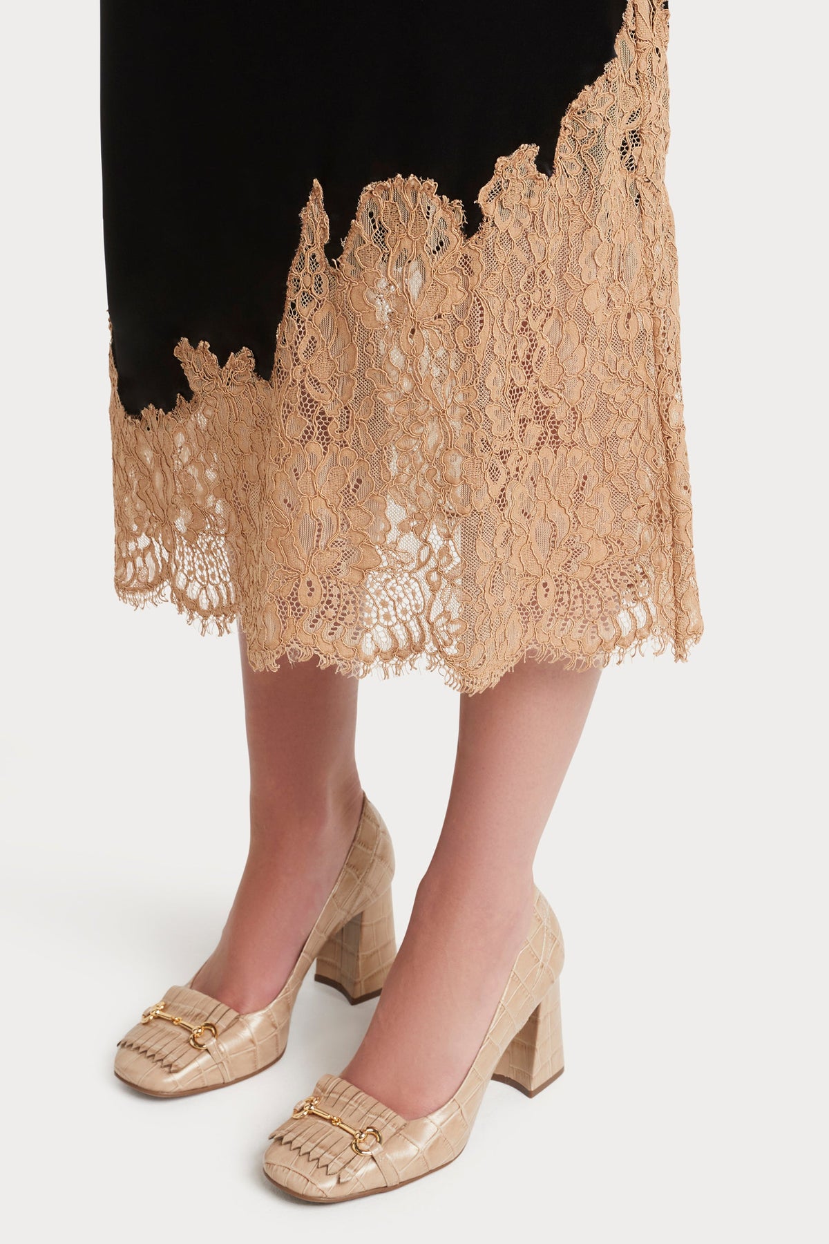 A statement midi skirt crafted in smooth acetate with lace hem detailing for elevated occasions.