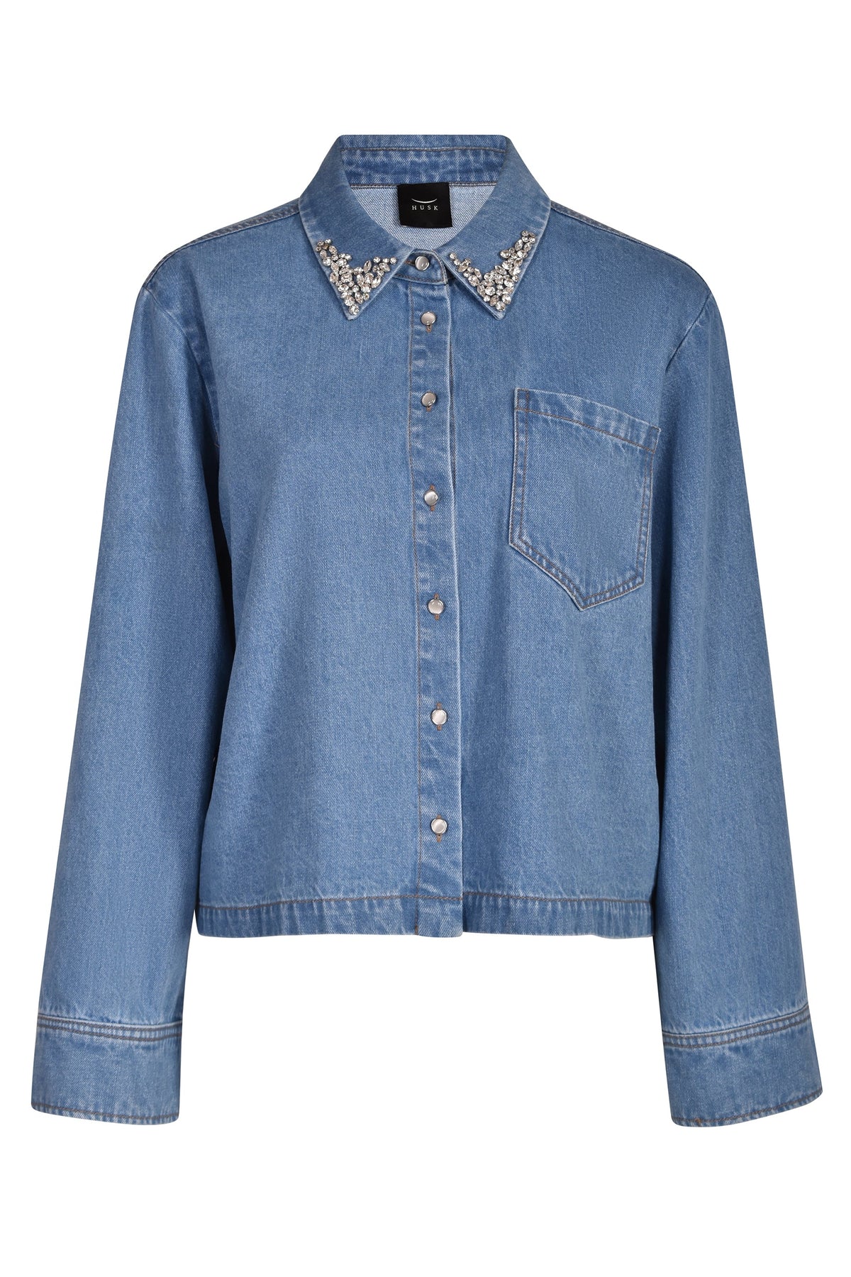 - Crystal button along collar edge
